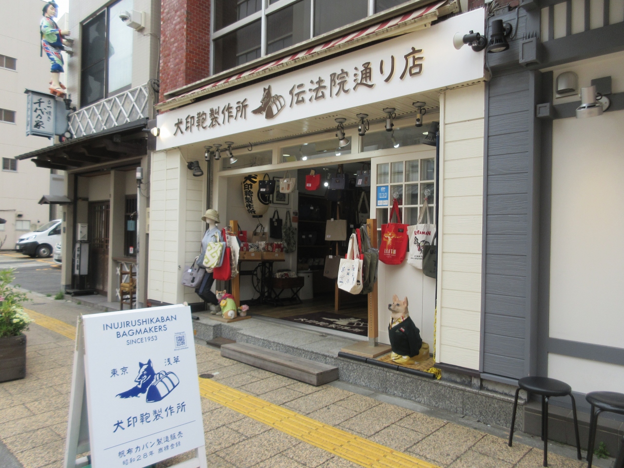 伝法院東通り沿いに建つ、昭和28年創業の布鞄の店です。店内には帆布で作った手さげ鞄や、肩掛け鞄、旅行用の大きなカバンなど、色々な種類の異なった大きさの鞄が並んでいて、自分だけの一品を探すことができます。色々な色のブックカバーも販売されていました。値はやや張りますが、しっかりした軽くて強い布で作られているので、使い込むほど味が出てきて長持ちします。かっぱ橋にも姉妹店がありますが、ドアが閉まっていて入店しにくく感じましたが、こちらの店はドアも窓もなく開放的で入店しやすく感じられました。