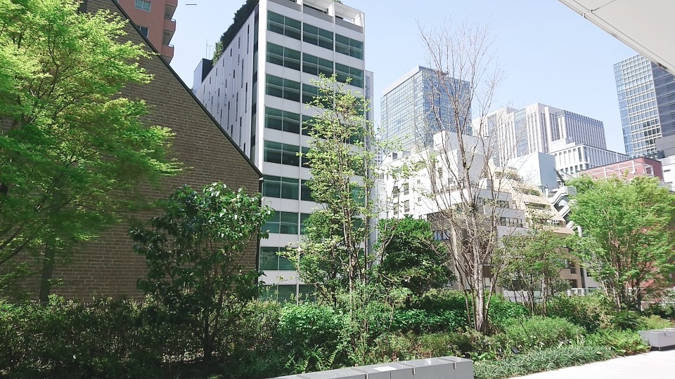 森タワーとビジネスタワーは二階のデッキで繋がれていて行き来も自由、周囲はオーバル広場や植樹も進んで緑が心地好い空間になっています。