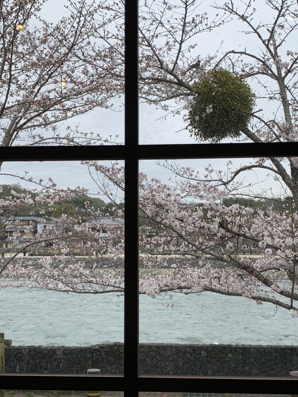 ちょうど、桜の美しい時で、店内窓から外の川べり、桜の鑑賞をしつつ
