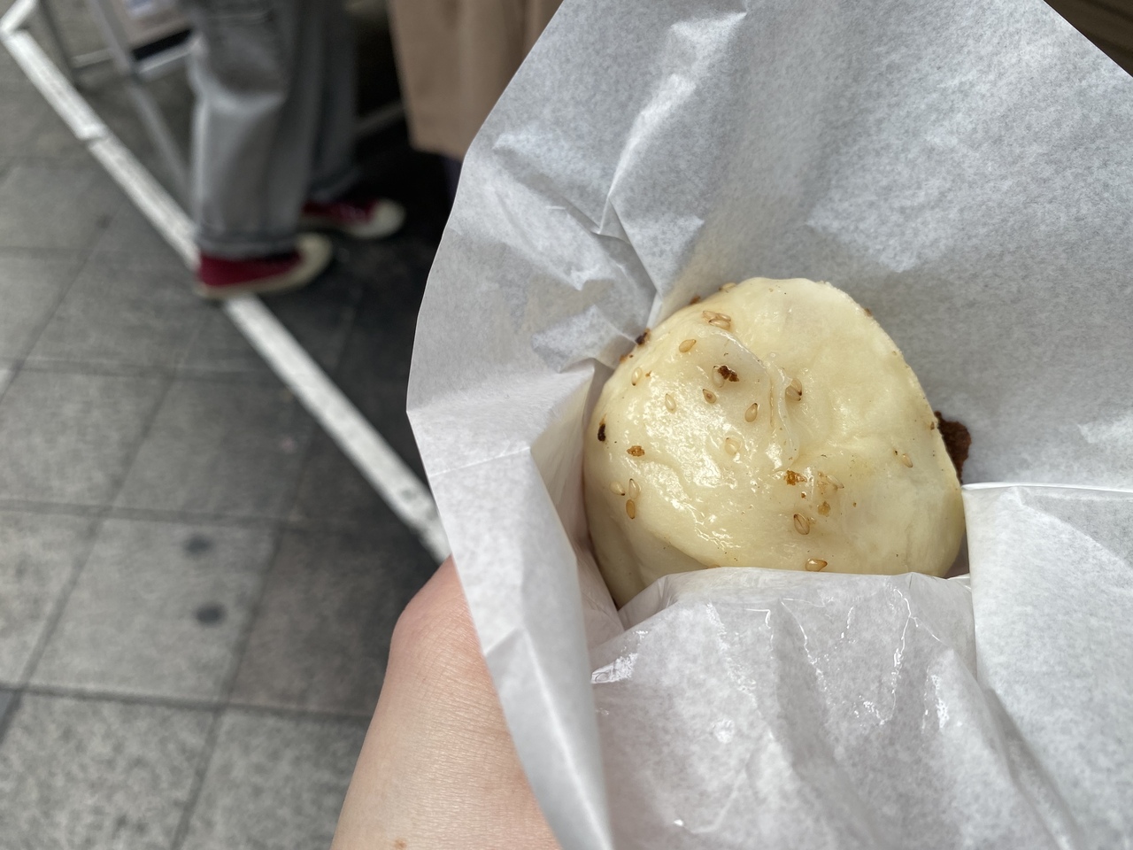 私も行列に並び、肉包ロウパオ(肉入り焼き包子)を購入しました。