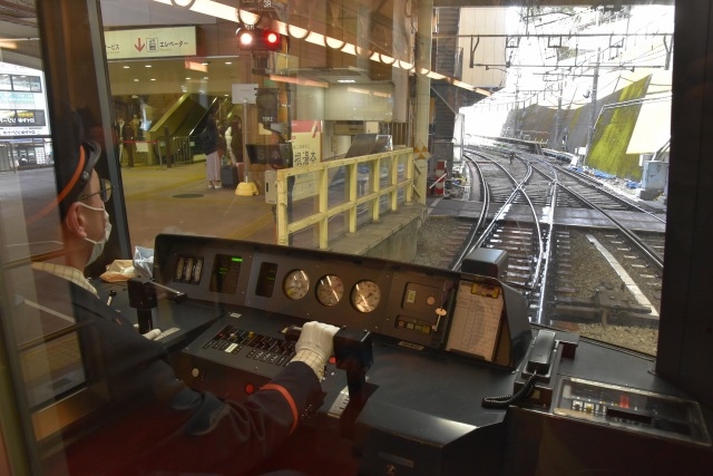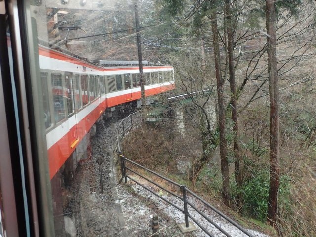 箱根湯本駅から桃源台駅へ3つの乗り物を乗り継ぐが、その1番目が登山電車。早雲山駅まで約45分。途中、スイッチバックが3か所あり、それぞれの場所で車掌と運転士がホームを歩いてすれ違いながら入れ替わる光景があり、沿線の景色と並んで一緒に楽しむことができた。