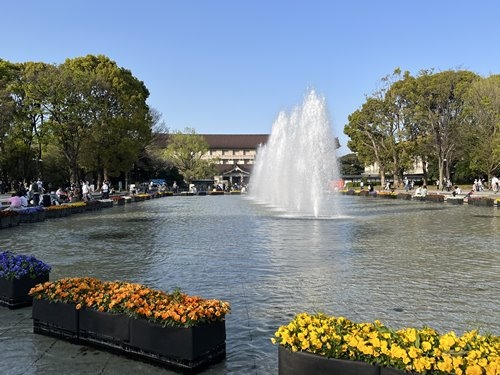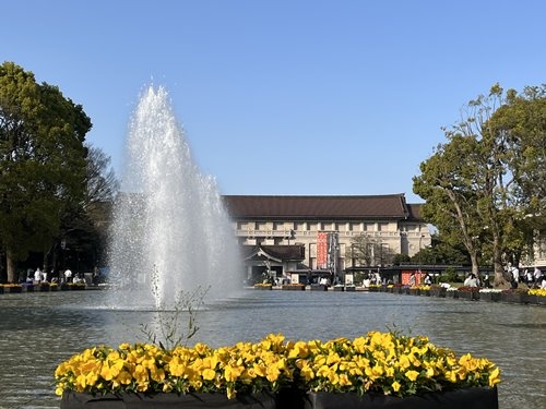 上野公園の中央にある大噴水です。「竹の台」はかつての付近の地名だそうです。行ったのは午後遅めの時間帯でしたが、たくさんの人がくつろいでいました。花壇もきれいで背景に国立博物館を配置して納得の一枚が撮れました。