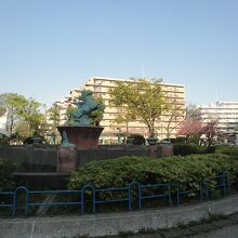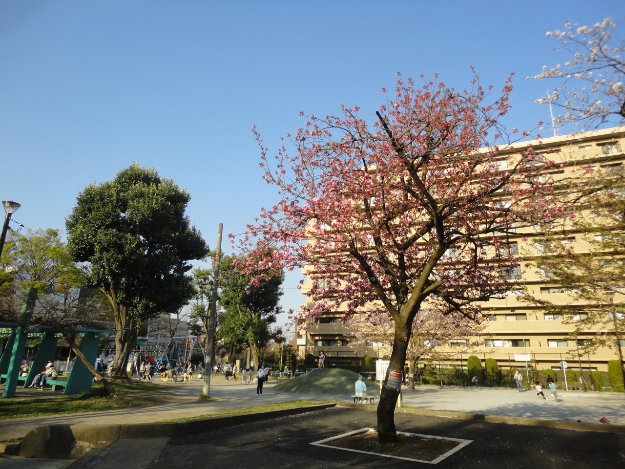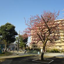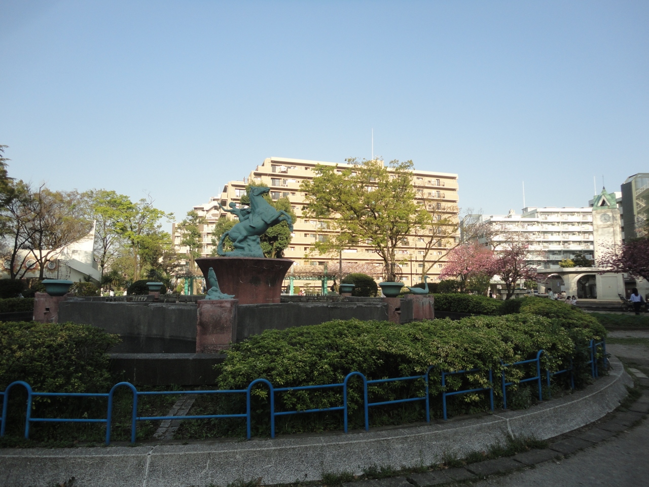 赤羽駅の西口を出てすぐ、西友やダイエーなどのすぐ近くで、周りはマンションなどに囲まれた場所のため、休日の夕方に訪れたら、子供から大人まで、大勢の人で賑わっていました。子供が遊ぶ遊具のすぐ近くに、西洋っぽい円形の池に彫像などもあって、昭和レトロな雰囲気もしました。4月初めは濃いピンクの桜が綺麗でした。