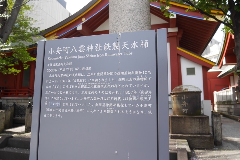 この神社にある鉄製の天水桶はなんと、千代田区の指定文化財だそうで、しっかりと説明パネルも立てられています。東京の神社はほかの地方の神社よりこの天水桶を見かける割合が高いなぁと感じます。まさしく火事と喧嘩は江戸の華…との言葉がある通り、火事が多かったのでしょう。しかし、鉄の桶とは、とっさのときに持ち上げられないですね。