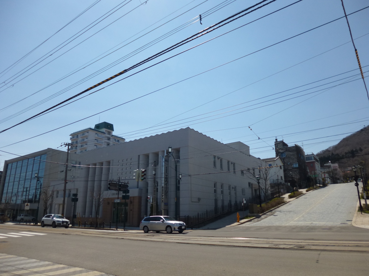 函館の市電を通る海峡通りと、八幡坂の交差点、通りの両側に重厚な建物が立っています。両方とも銀行として建てられたものです。坂の上の方の現SEC電算センタービルは、軒の三角形の連続のデザインなどが新しさを感じさせる建物ですが、国立銀行、百十三銀行本店として大正時代に建てられてものだそうです。当時のドイツの建築様式を取り入れた新しさと重厚さを感じる建物です。