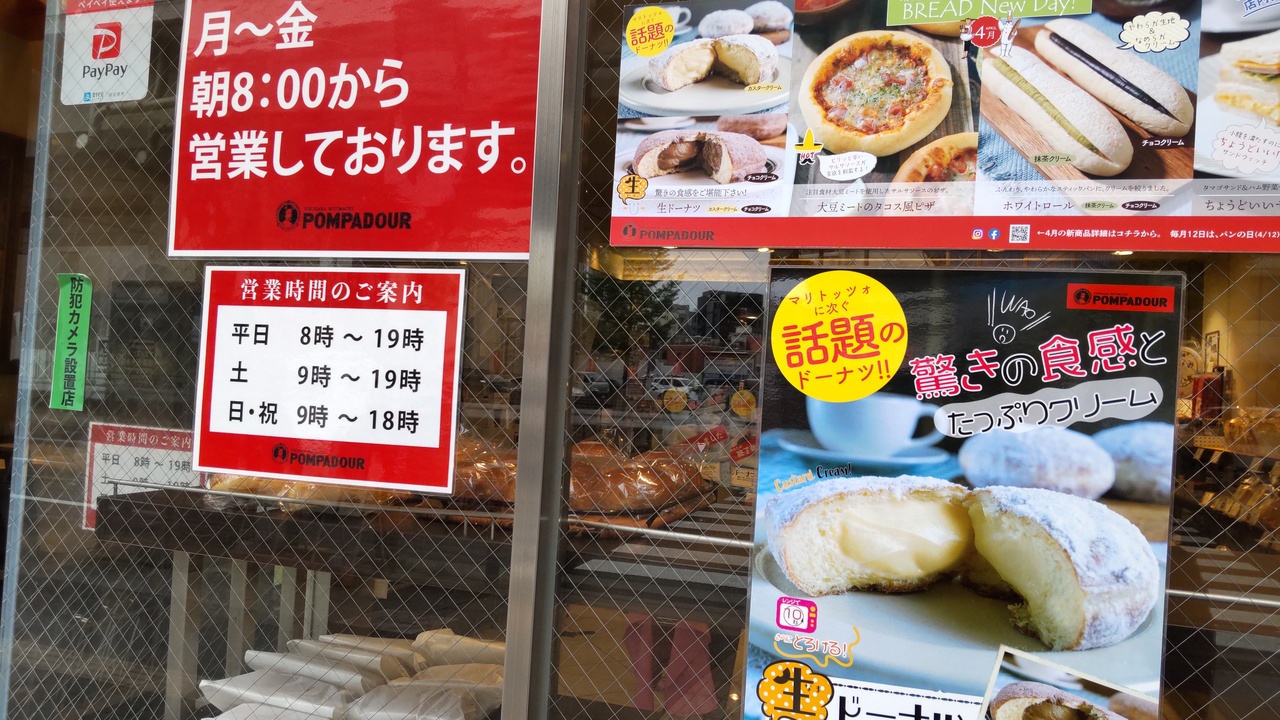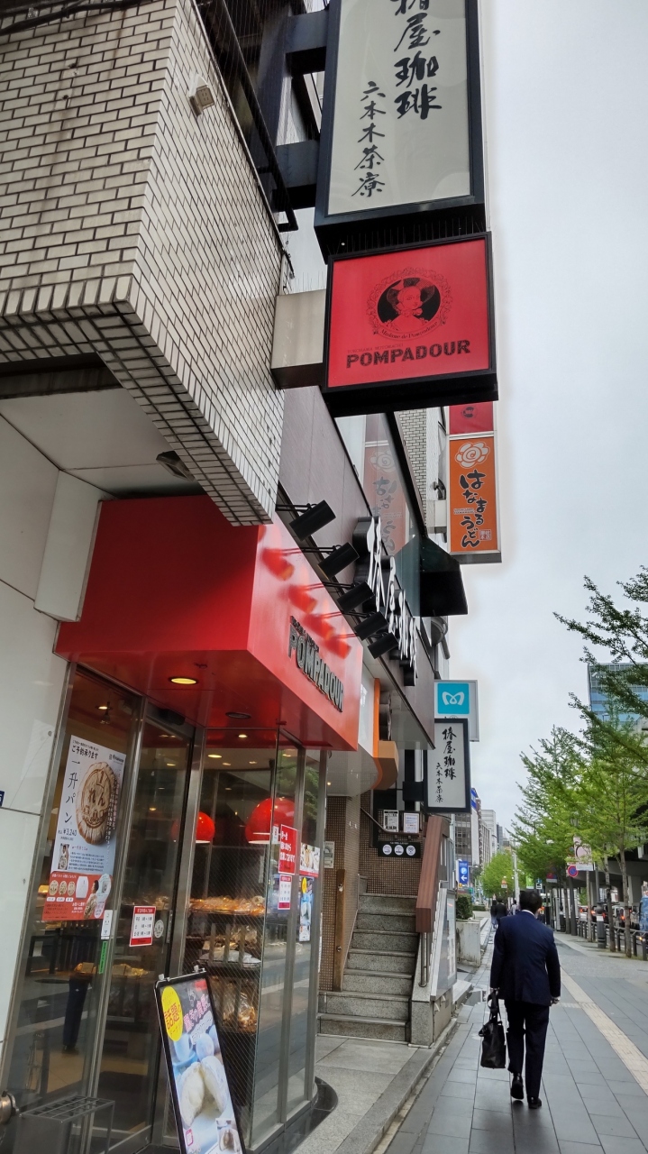 赤の看板とパンの香りですぐわかるポンパドウルの店舗があります。