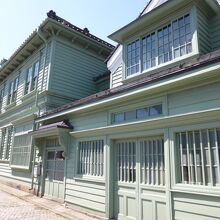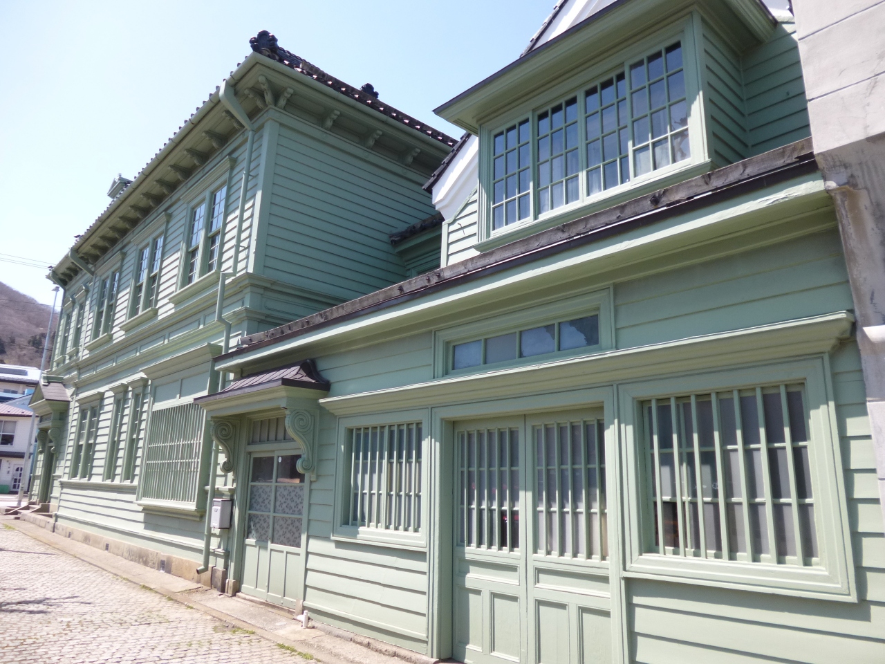 元町公園に通じる基坂と市電の走る海峡通りの交差点にペパーミントグリーンの木造の可愛らしい建物があります。現在も会社として使われている建物ですので、内部に入ることはできません。大正5年に建てれらた建物で、鉄板葺き屋根にルネッサンス様式の突き出た窓などがあり、会社とは思えない建物です。