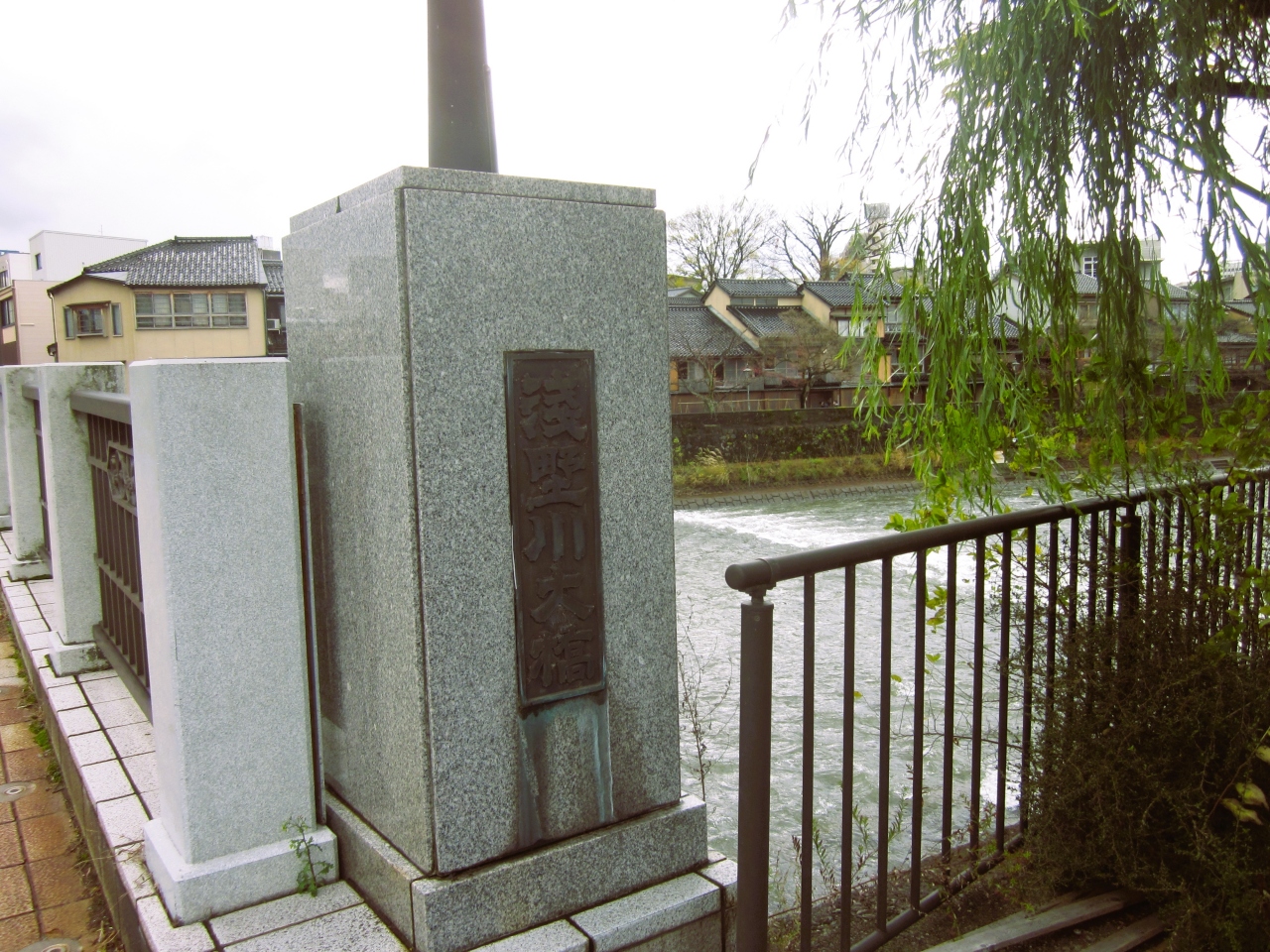 浅野川に架かる橋で、浅野川は観光客にも人気のようで、橋の上で記念撮影されている方が多かったです。少し先にも橋があって、そちらの橋も、観光客に人気のようです。橋の近くから河川敷へも降りる事ができるようで、地元の方で散歩されている方も見かけました。