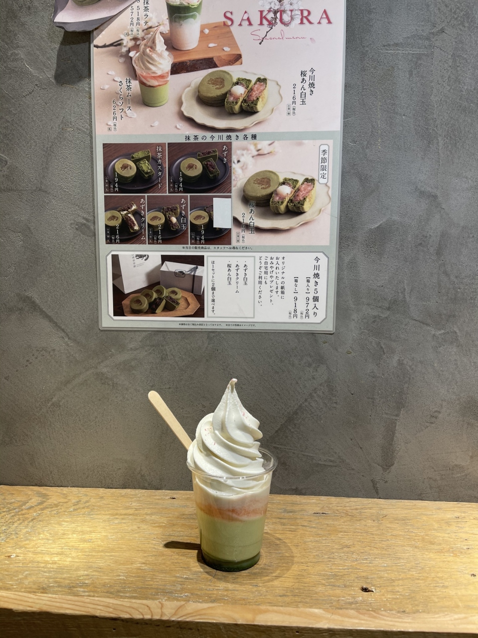 新宿ルミネ1の地下2階、飲食フロアの奥の方にある抹茶スタンド。店舗のさらに奥にカウンターがあり立って食べることが可能。ちょうど桜の季節で抹茶ムースにさくらソースとソフトクリームがトッピングされた限定スイーツを購入。628円。ほとんどのスイーツが216円から194円で手軽。