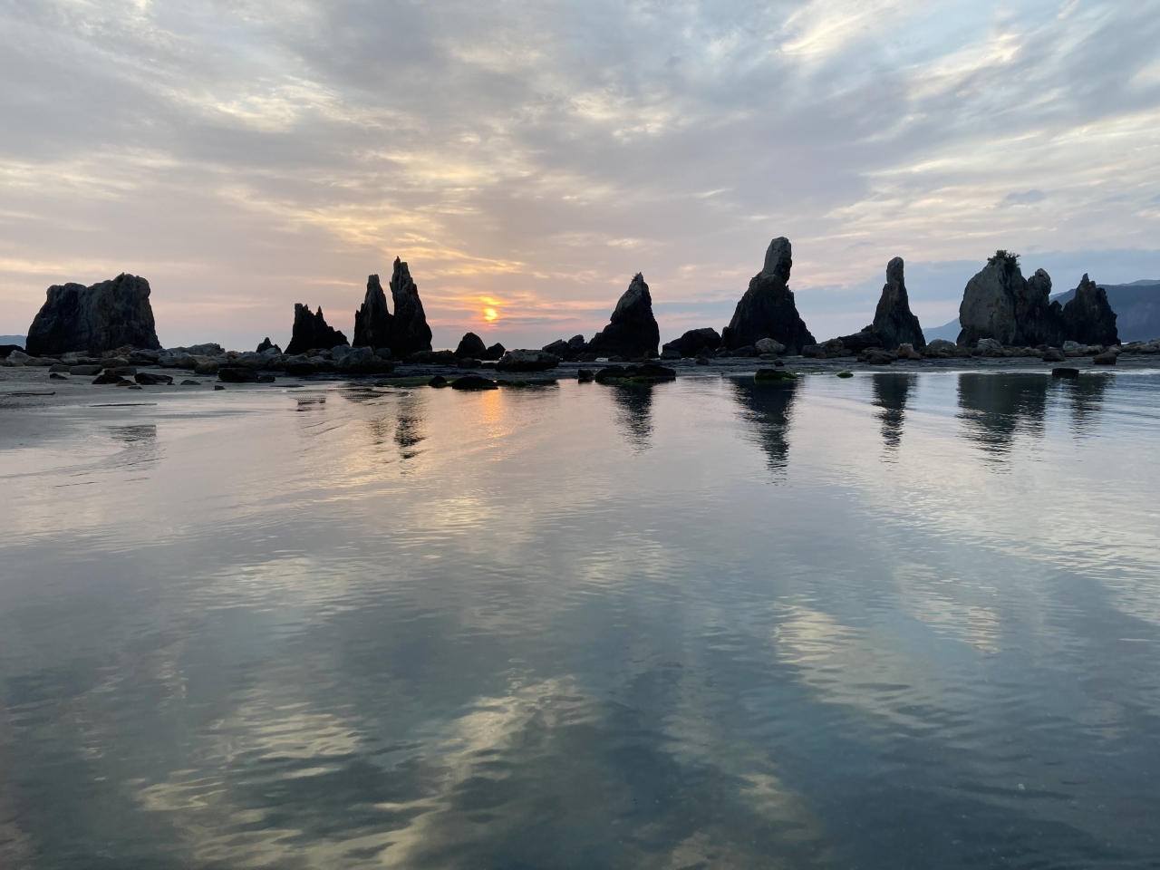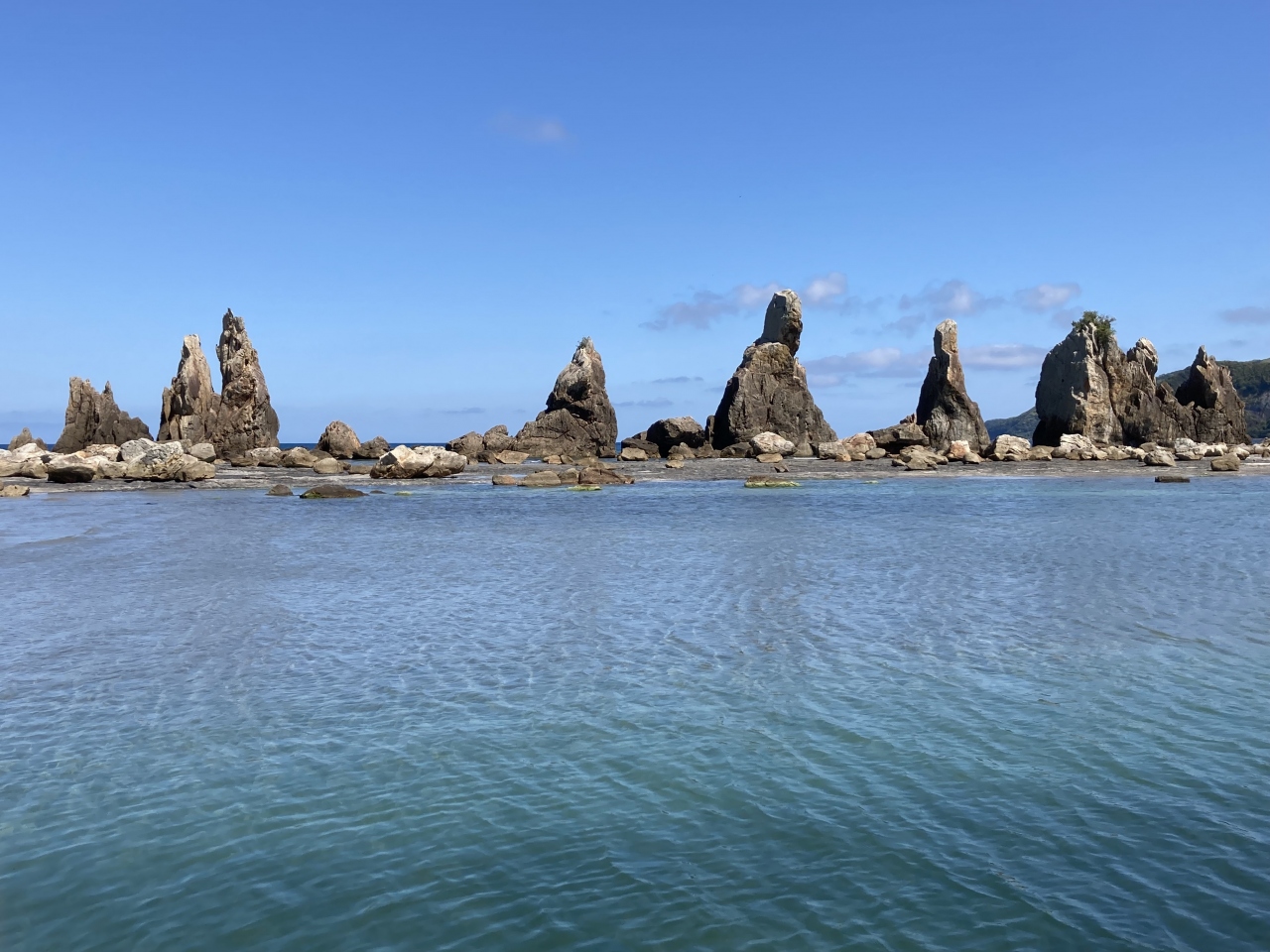 満潮時は海に奇岩が浮かんだ景色が見られるが、干潮時には陸続きになり、岩のそばまで歩いて行くことはできるが、景色としてはやはり海に浮かんだ景色の方が勝る。