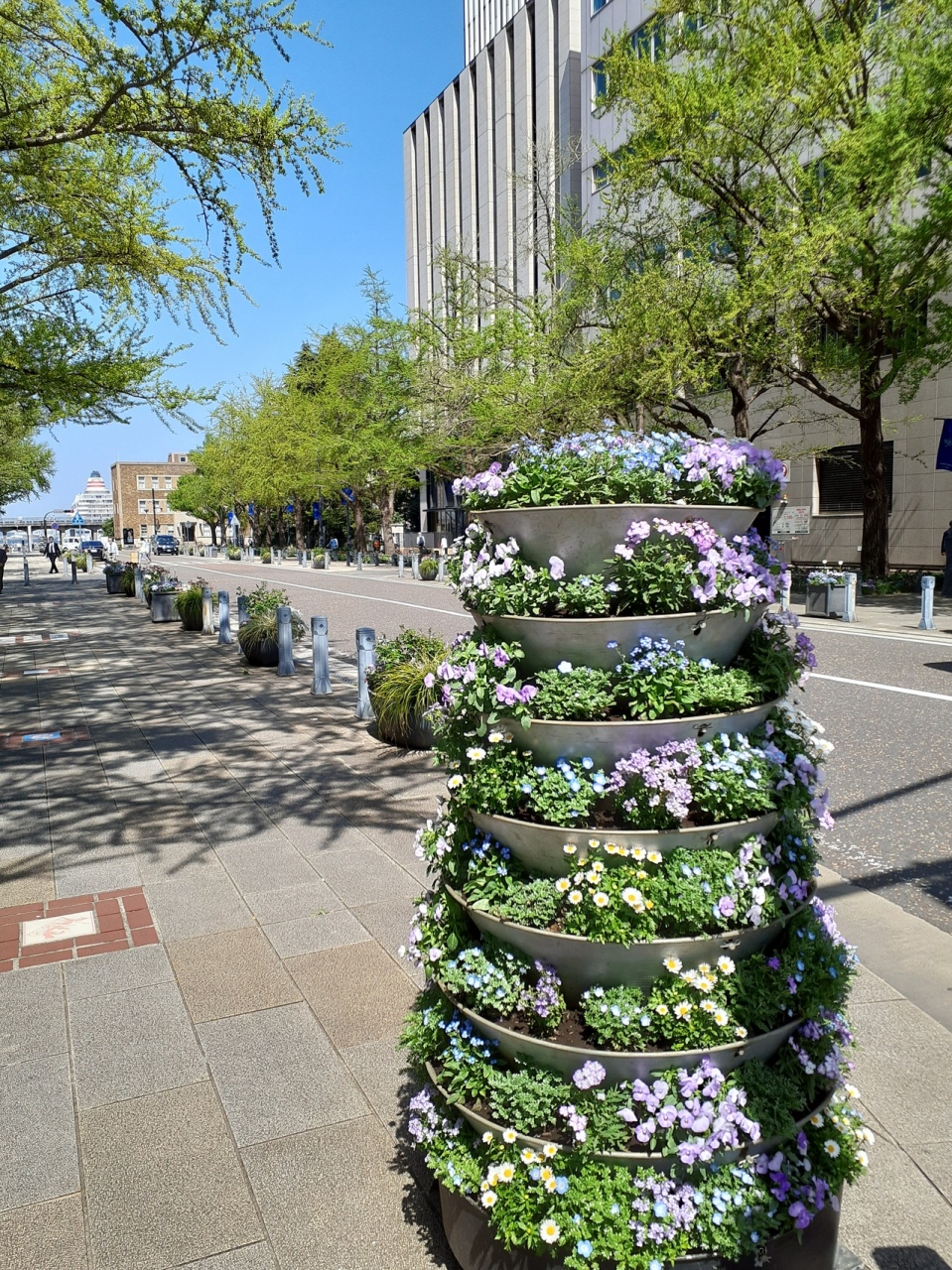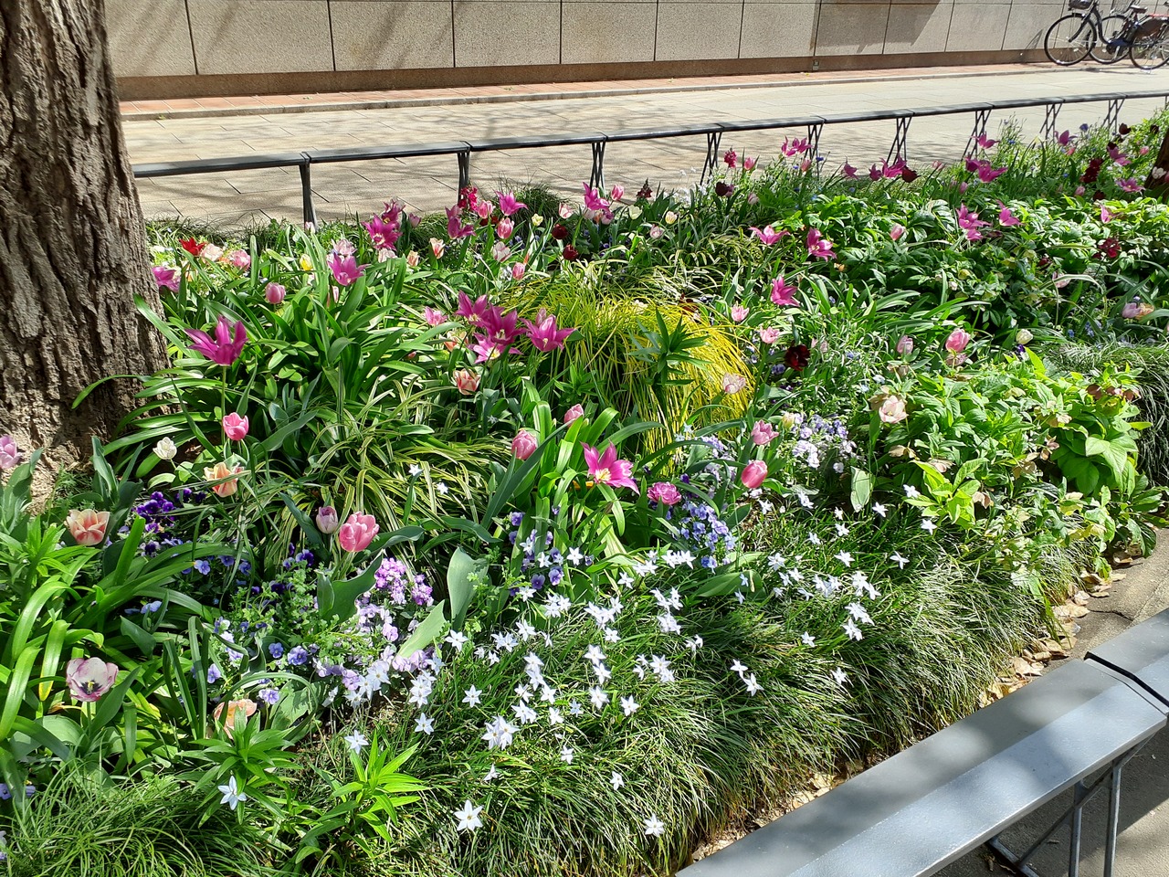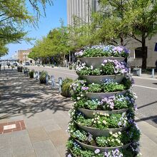 秋には銀杏並木が美しい道路として有名です。ちょうど今、チューリップが見頃を迎えています。特に紫色のお花がとても綺麗で、花をバックに記念撮影する観光客でにぎわっていました。