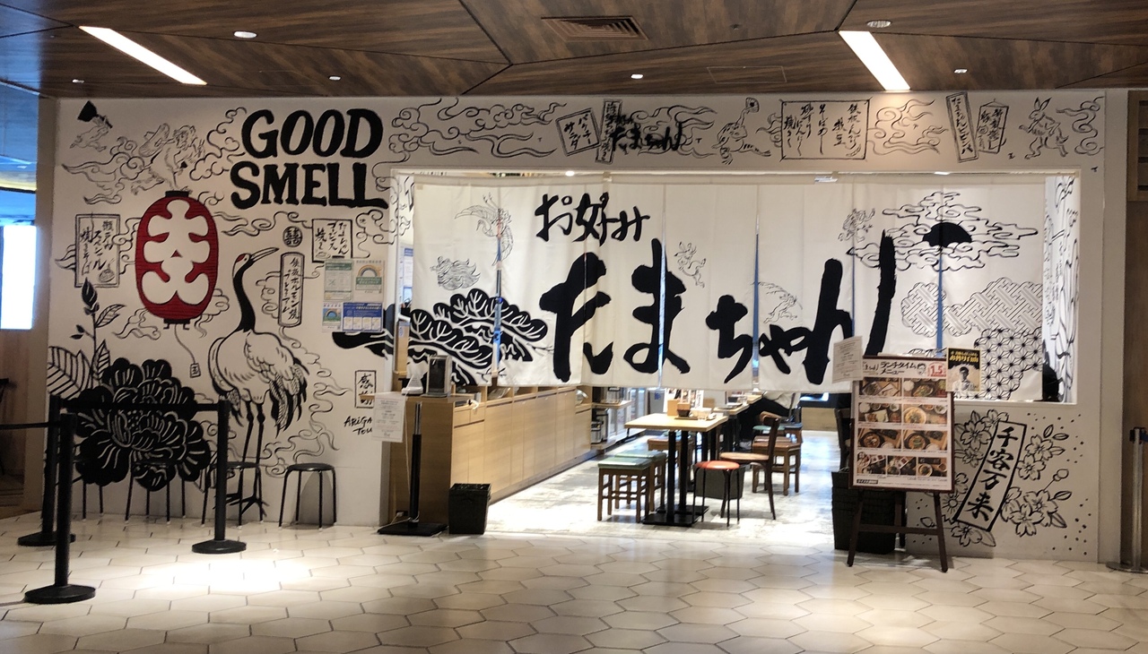 渋谷スクランブルスクエアの中にあります。大阪B級グルメがいろいろ楽しめます。ハーフサイズのお好み焼きと焼きそばをオーダーしました。お好み焼きはふわふわ、ソースとマヨネーズたっぷりの濃いめでした。焼きそばはイカがたくさん入ってました。