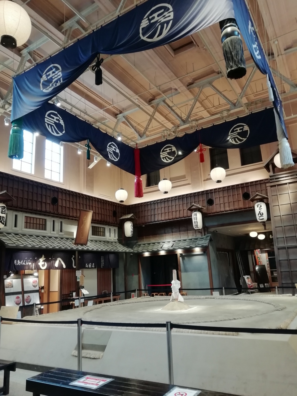 平日の16時過ぎに行ったので飲食店はお昼休みか、人も少なく閑散としてました。きっとランチ時間なら賑わっていたかも。観光案内所に小さな売店があり少しだけお土産ものが並んでいましたが、欲しいものは無く。中央にある土俵は大きくて見応えがありました。