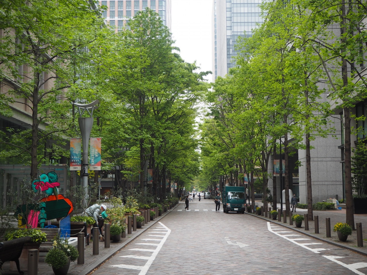 丸の内仲通りは丸の内にある行幸通りと直角に交わる通りで、JRの線路と並行に走る通りです。通りは広くありませんが、歩道が広く、街路樹が生い茂り、ィ通りではイベントなども行われる場所でもあります。アート作品も通りには展示されているので、歩いていても気分がいいです。