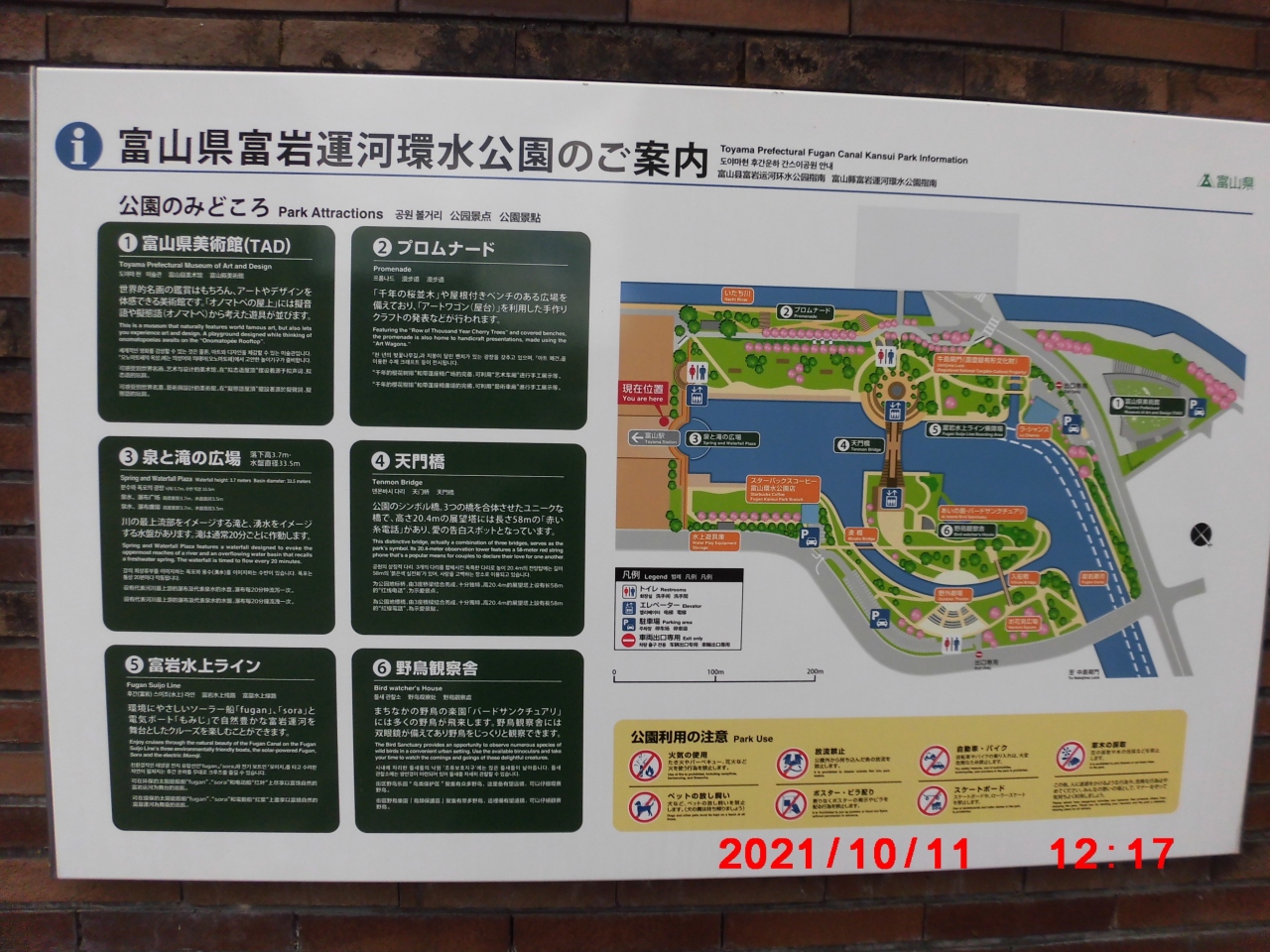富山市観光で立ち寄りました。富岩運河環水公園は、JR富山駅北口から徒歩10分程で着きました。広い敷地に見どころのある施設がいくつもありました。運河環水公園 の名前の通り水を活かした公園でした。個人的には、泉と滝の広場の滝が凄かったのと、天門橋が素敵でした。