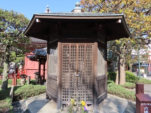 浅草寺による説明板、台東区による説明板、観光連盟による説明板…浅草寺の境内には入り交じっていますね。こちらは東京都による説明板で、それもそのはず東京都指定旧跡になっているのがその理由です。明治期に元花川戸から移設されたそうですが一説によれば12世紀、もしくは14世紀の石燈籠で六面に地蔵が彫られているそうです。というか保護するために覆いがかけられていて中がよく見えないわけですが、説明板にはその釈明がありません。その点は不十分で価値半減と思います。