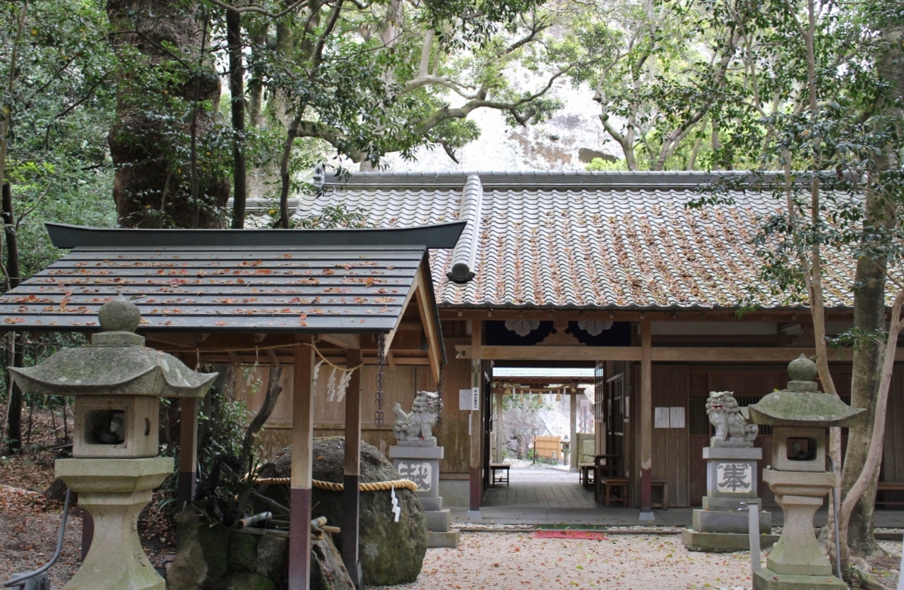 この神社には正面の鳥居や参道はあるが、本殿や拝殿はなく、参道を進んだ正面の大きな岩をご神体として直接参拝することになる。