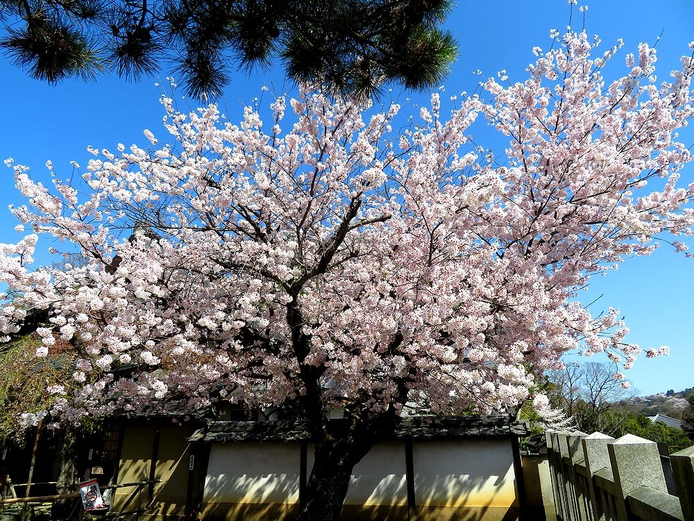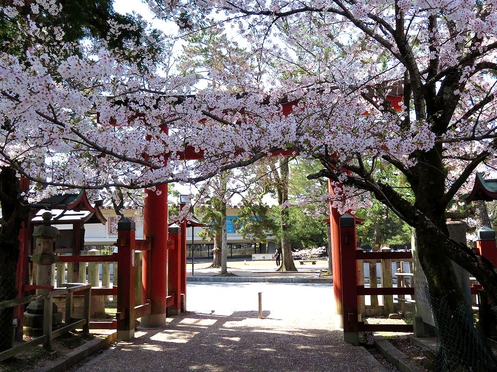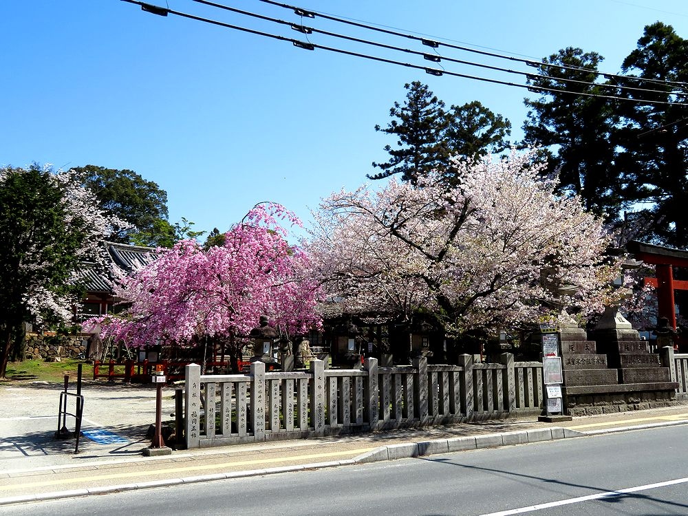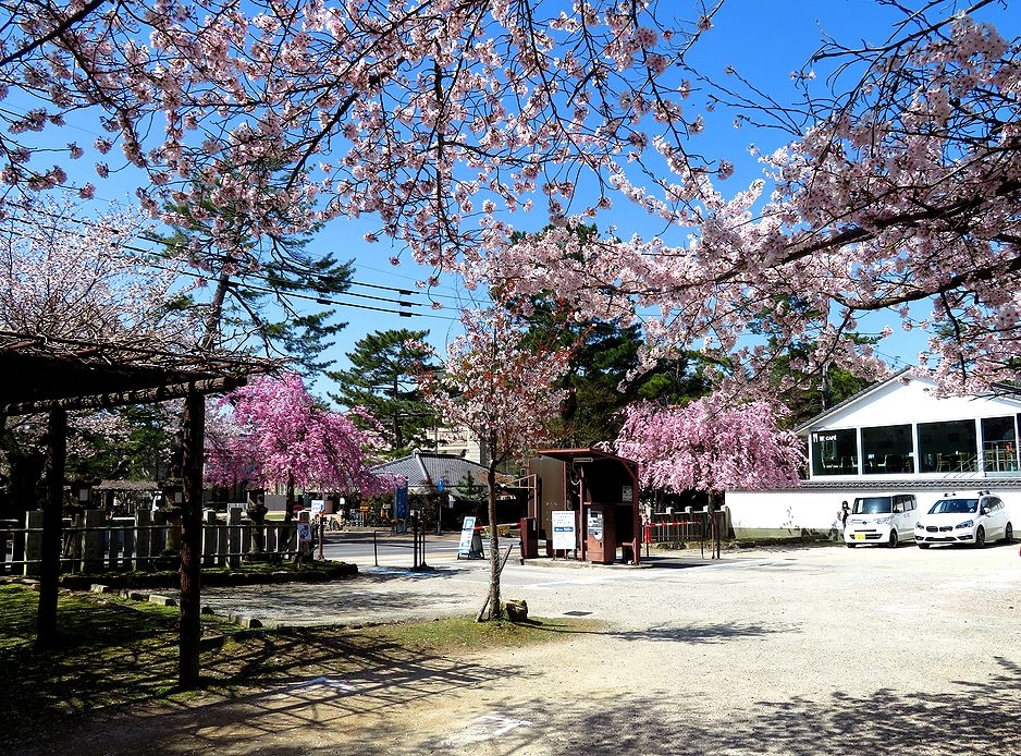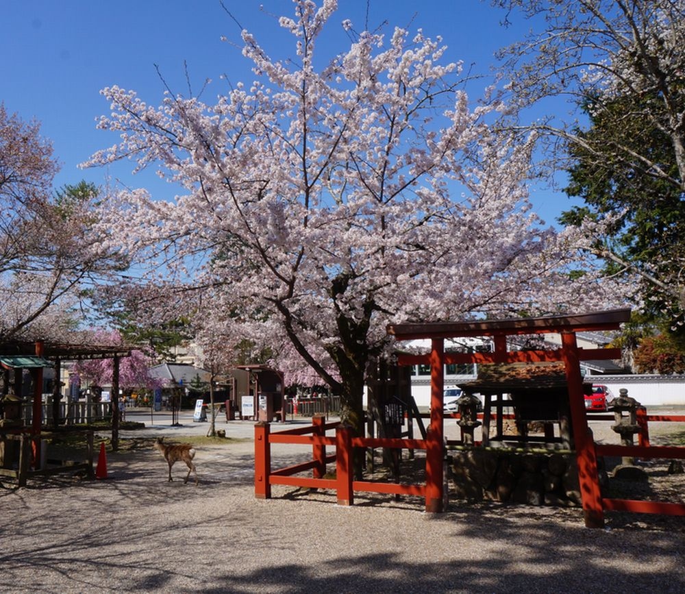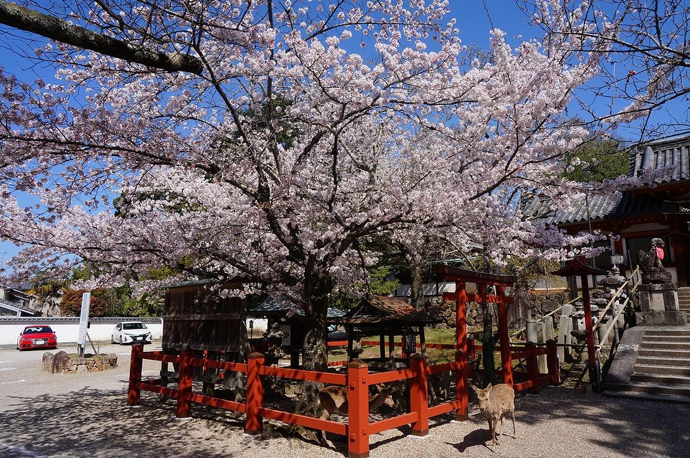 2022年4月5日(火)に近鉄奈良駅から歩いて向かいました。奈良公園内では桜は固まって咲いているところが少なかったのですが、ここだけは固まって咲いていました。この神社は冷蔵・製氷販売の守り神だそうです。境内の隅からは若草山が遠望でき、仏像館から大仏殿に向かう途中にあります。
