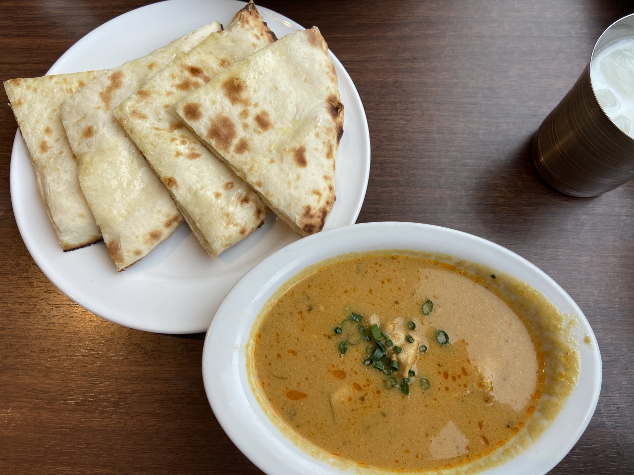 今回はチキンカレーセット(890円)にチーズナン(+200円)をいただきました。よく考えたら普通のランチセットをいただいたのは初めてかもしれませんが、白い大きめのお皿に入ってきたカレーはなんだか水っぽくて具も少なくてちっとも美味しくない。スープカレー?それとも分量間違えたの?はたまたシェフが変わったのか・・?
