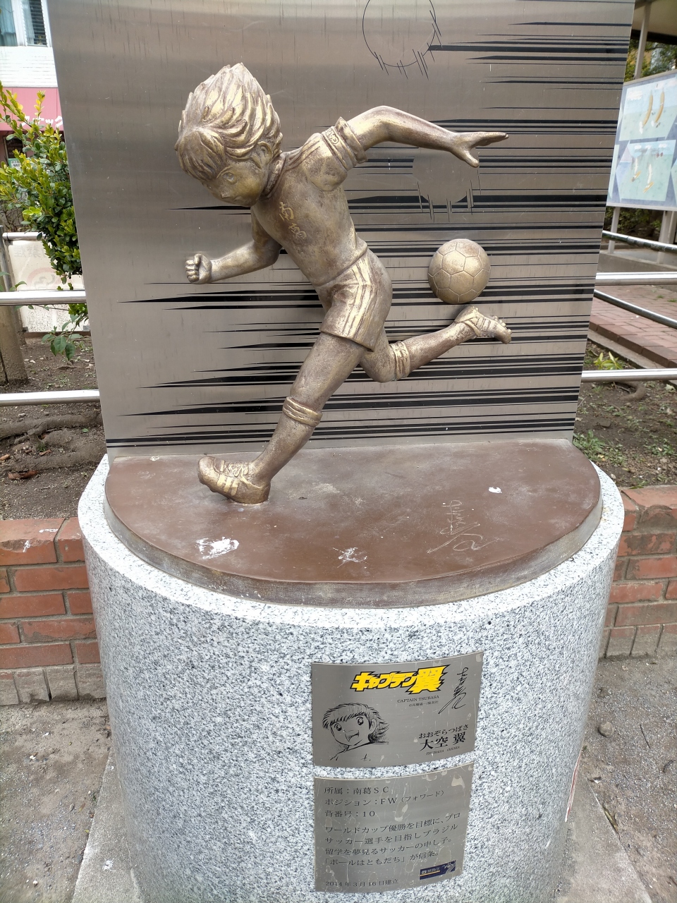 サッカーアニメの有名なキャプテン翼のモニュメントが散らばってある