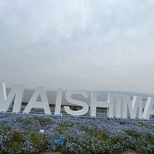 お花畑の中に 〈ネモにゃん〉が います。『ネモフィラ祭り』の公式キャラクターだそうです(^^)