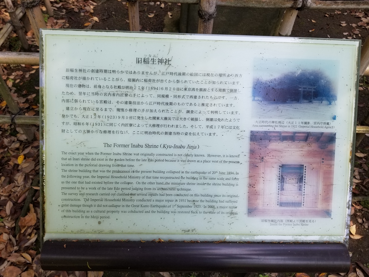 1894年6月20日に東京湾を震源とする地震で倒壊したため、翌年に当時の宮内省内匠寮の手によって、離宮内にあった数社をまとめ、稲生神社を再建した。