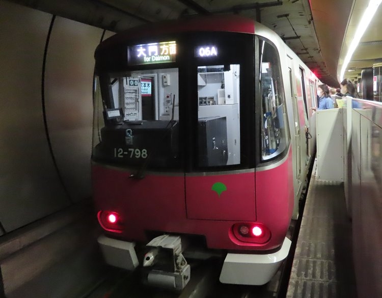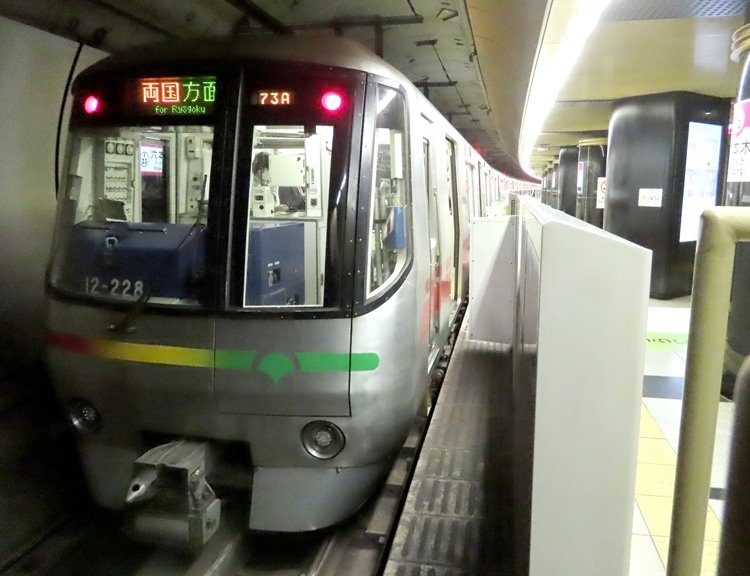 環状部と放射部を合体した路線形で全38駅で40.7キロ。1991年開業の新しい路線の割には他線との相互乗り入れが皆無で屋外で車両を見ることのできない撮り鉄泣かせの路線です。いろいろ情報収集をして六本木駅のホーム、車両後方でカメラを構えましたが、ホームドアから身を乗り出して先頭車両の運転台から見ているミラーに写らないように注意されてしまいました。そうです、大江戸線はワンマン運行なんですね。とにかく他路線のように「全身」撮影は不可能な特殊な路線でした。車両基地は江東区の木場あたりにあり、本線から分かれてそこまで地下を走っているとのこと。