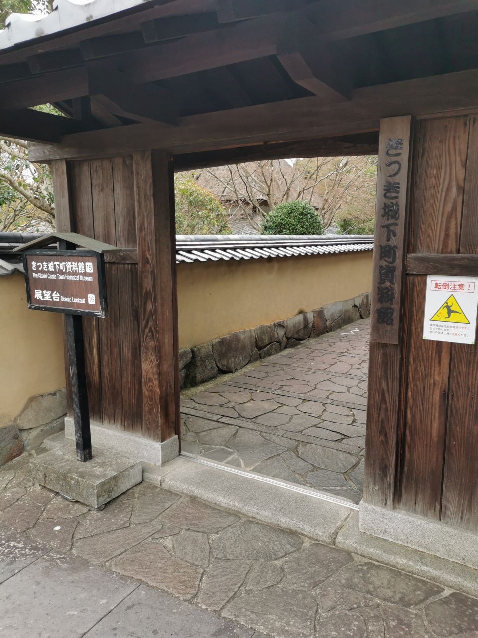 杵築の南台武家屋敷を海側に歩くと「きつき城下町資料館」の入り口があります。坂路を上がると左手に入り口があります。当日は曜日が悪くて休館日。入り口まで行ってみましたがコンクリート製の綺麗な建物でした。資料館の裏手を少し歩くと杵築城と海が一望できる展望台と古民家の一松邸があります。これ見るだけでも価値があります。