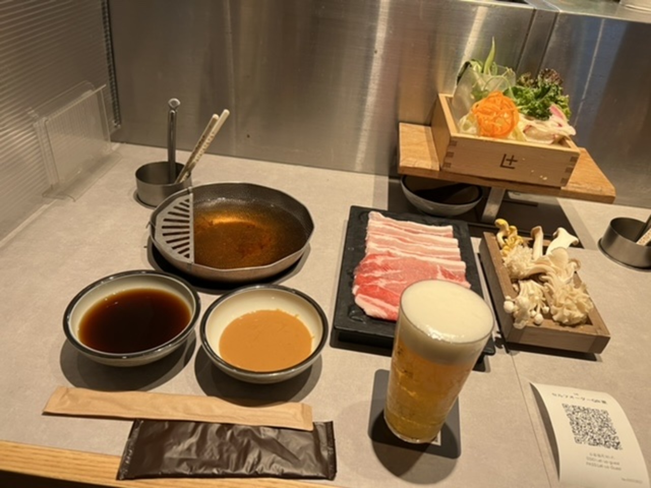 武蔵小杉駅南口から少し歩いたところにあるしゃぶしゃぶ屋さんです。1人1鍋の1人しゃぶしゃぶがコンセプトのお店です。夕方に入りました。