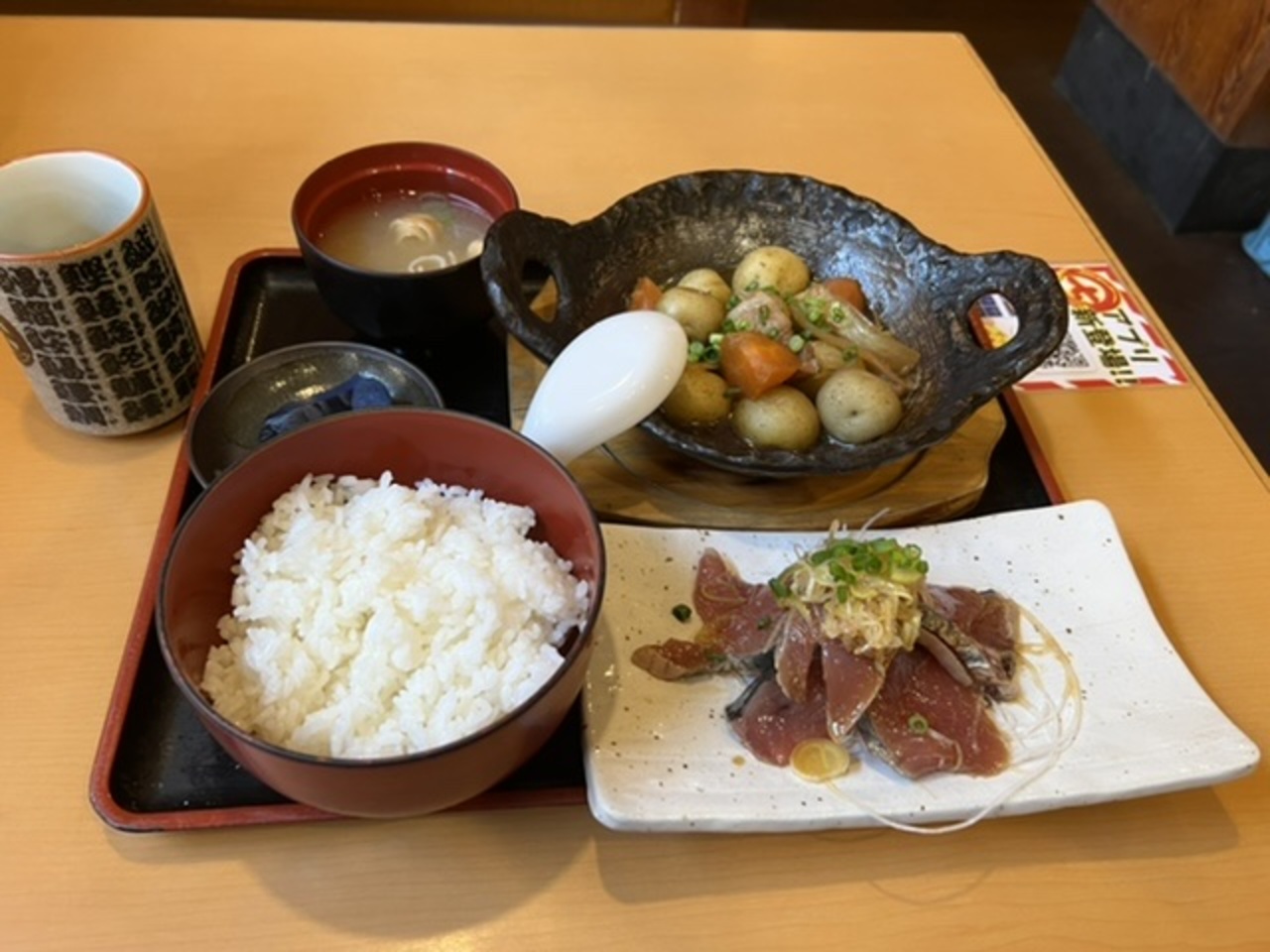 食べたのはカツオねぎまみれと肉じゃが定食1,000円!カツオは美味しかったですが肉じゃがは新じゃが小玉の皮付きであまり味が染みておらずイマイチでしたね。
