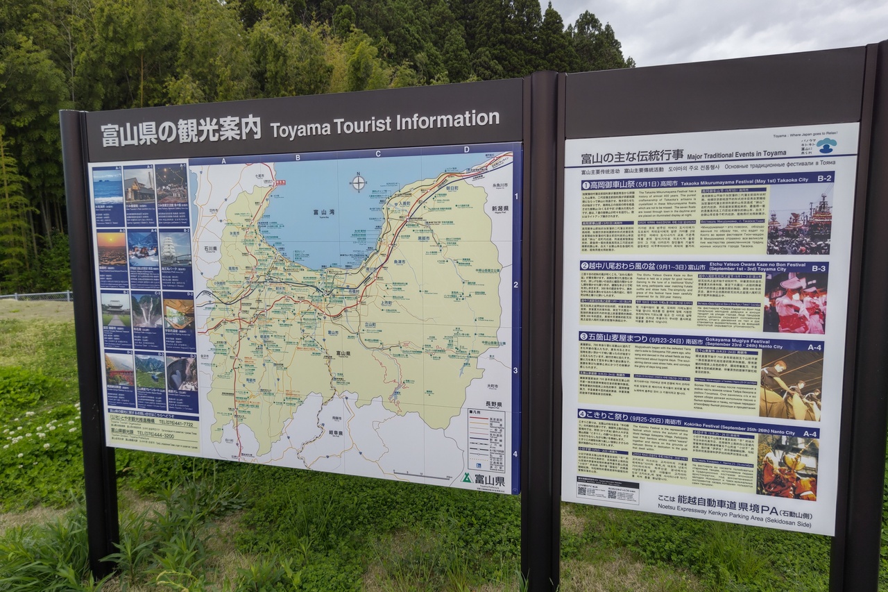 能越道上にあるパーキングエリア。富山県と石川県の県境にあります。それぞれの県の見どころが看板で示されていました。トイレがあるだけで、売店はなし。ドライブ中の休憩か、県境に思い入れがある方に立ち寄る価値があると思います。
