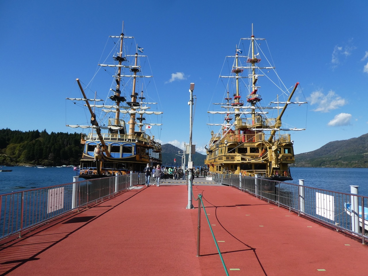 狭い桟橋の両側に海賊船が並ぶ光景が見られるのは芦ノ湖の3つの港のうちここだけでした。海賊船の並びの写真を狙うならぜひともこの港へ。船の到着した瞬間と出港の直前が写真タイムです。