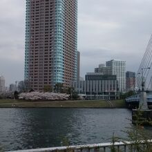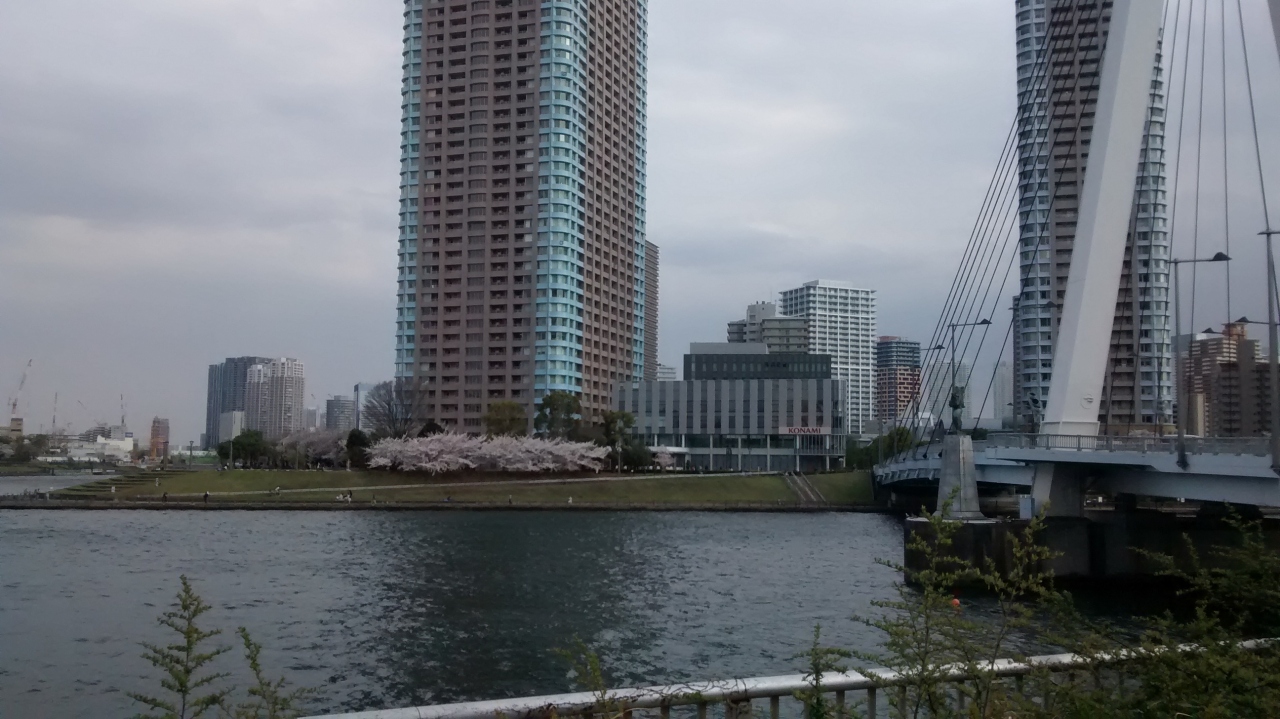 中央大橋は中央区にたくさんある橋の一つで、絶対見逃せない観光アトラクションです。添付写真のように、モダンなデザインで、マジで絵になる景色が見られる場所です。川と後方の満開のソメイヨシノと高層タワーマンションのコントラストが絶妙でした。
