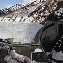 ただし、4月の間は雪崩の恐れがあるので、展望台からダムを見ながらの外階段を降りることはできないそうです。登ってきた階段を逆戻りしました。