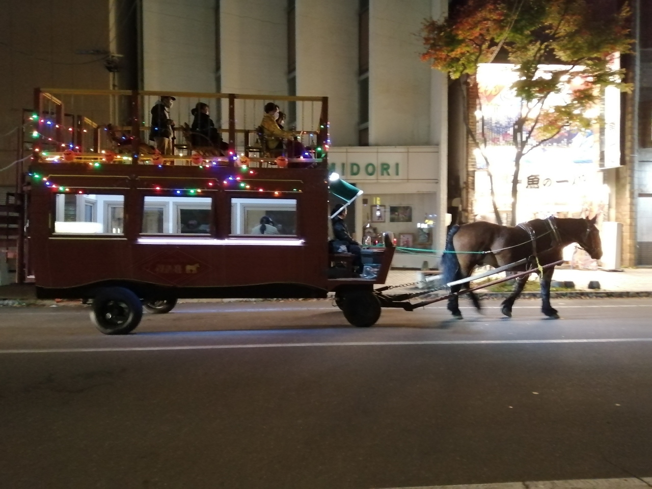 火曜日の18時頃に、ホテルに戻ろうと西1条通りを歩いていたら、馬車が来るのが見えました。