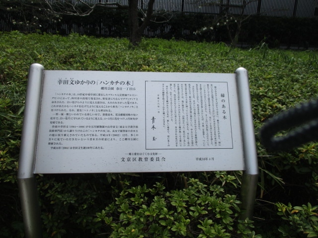 幸田露伴、幸田文の庭にあった木で平成14年に礫川公園に移植されたそうです。ハンカチの木は4月下旬から5月上旬に白い花びらのように見える苞があたかもハンカチを広げたように見えることからハンカチの木と名付けられたそうです。東京メトロ丸の内線後楽園駅から春日通り方面の礫川公園内にありました。少し来訪時期が早かったです。