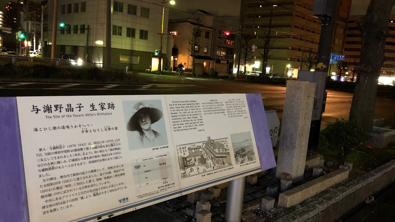 堺市中心部の大通り沿いにあります。歌人・与謝野晶子は、明治11年、堺のこの場所に生まれました。現在は、案内板と石碑が残るのみです。この近くにある観光複合施設「さかい利晶の杜」には、与謝野晶子博物館があります。