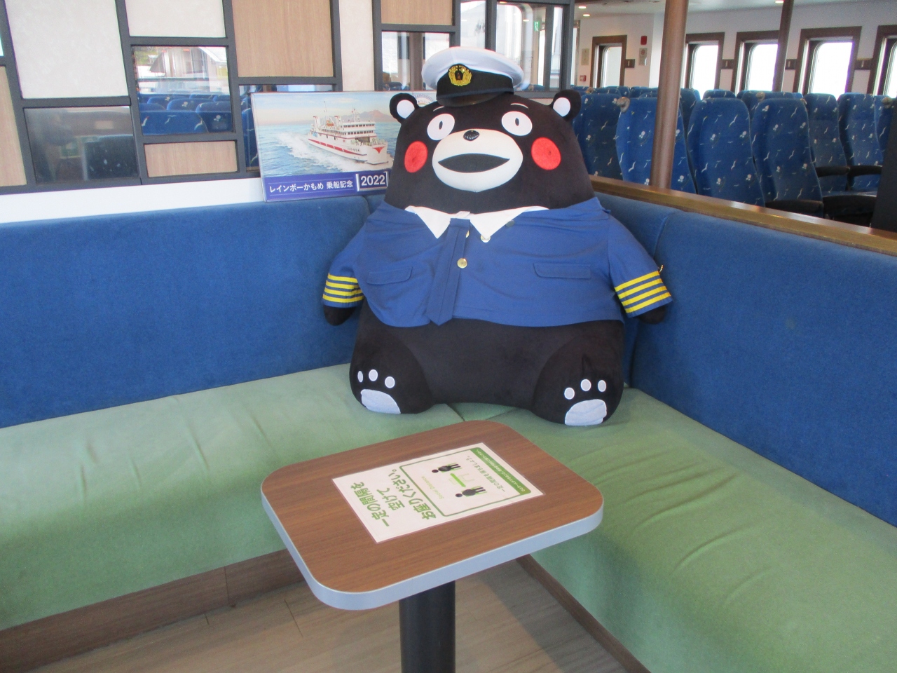 長崎県の島原市と熊本県の熊本市をフェリーで1時間で繋いでいるので、両方の県の方々は、観光にもビジネスにも、便利に行き来しているようで、車が沢山乗れるとても大きなフェリーでした。船内も綺麗で快適で、くまモンも船長さんもいました。