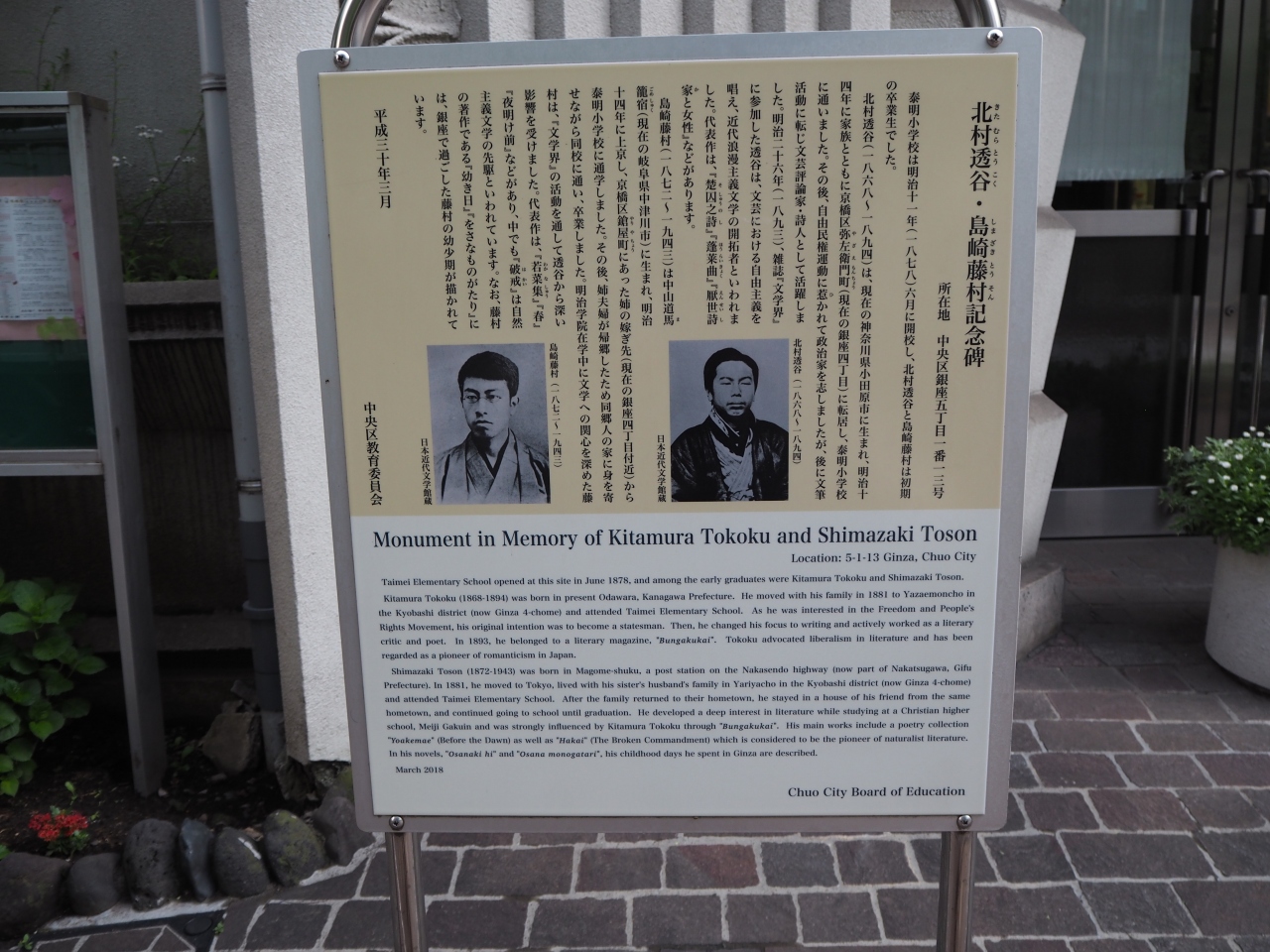 有楽町にも近い銀座の泰明小学校の正門の前に島崎藤村、北村透谷記念碑があります。1メートル弱ほどの石碑です。石碑の横には説明板があり、島崎藤村と北村透谷の2人が泰明小学校の卒業生だということです。由緒ある学校はすばらしい歴史(卒業生がいる)があるのだとわかりました。