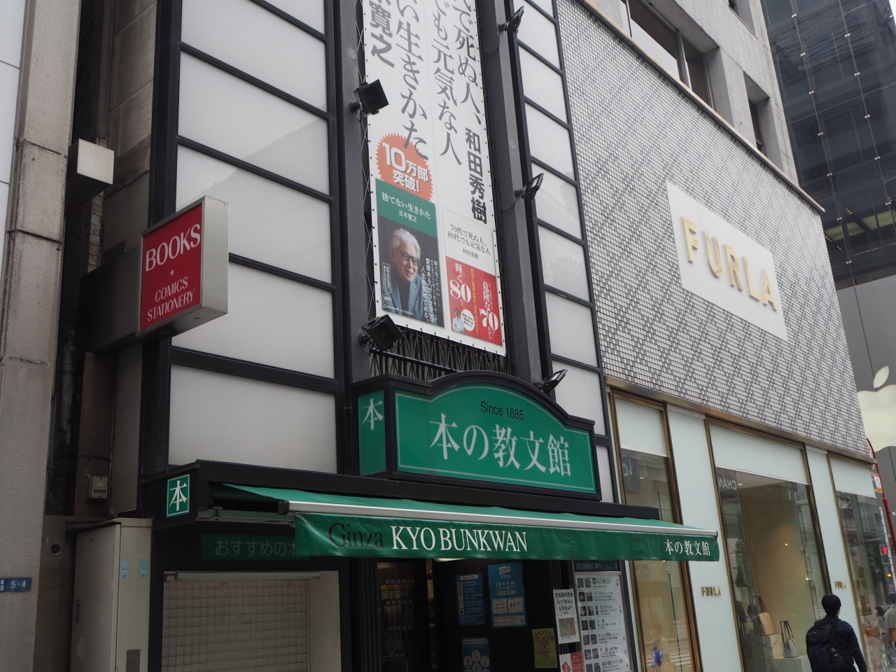 教文館は銀座中央通りと松屋通り交差する場所にあり、となりは真珠のミキモトです。教文館は老舗の書店で、一般書、専門書(宗教書)、児童書などを扱う書店です。建物、店内は歴史を感じますが、利益率の低い書店で銀座という一等地で経営を続けているのはすごいことです。となりにあるイタリアのバッグ店は教文者が貸している店舗でしょうか。