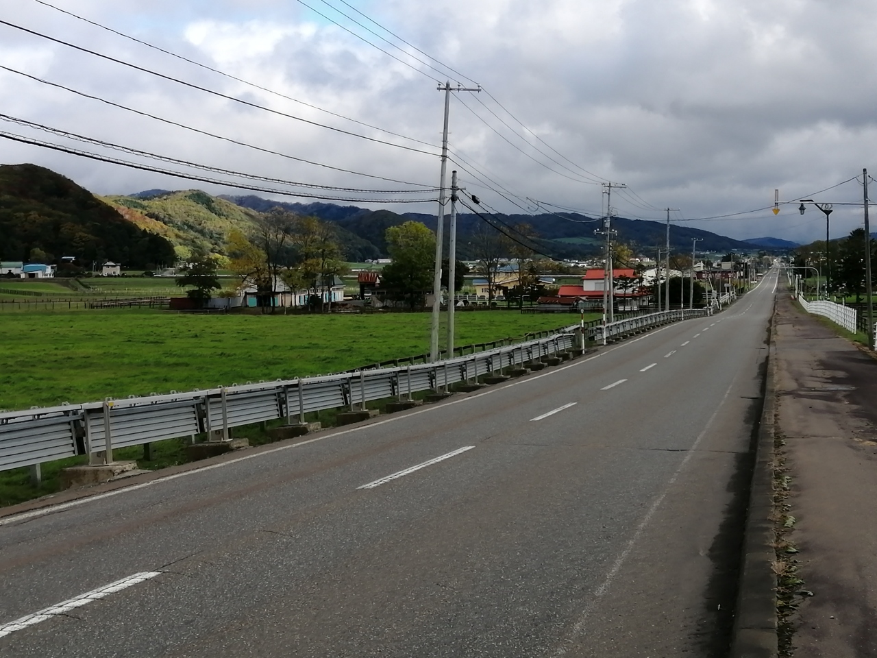 道路の両側に広い牧場が続き、馬がいる景色が楽しめます。