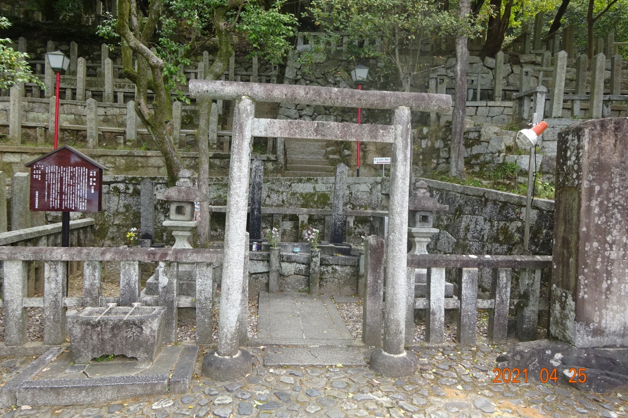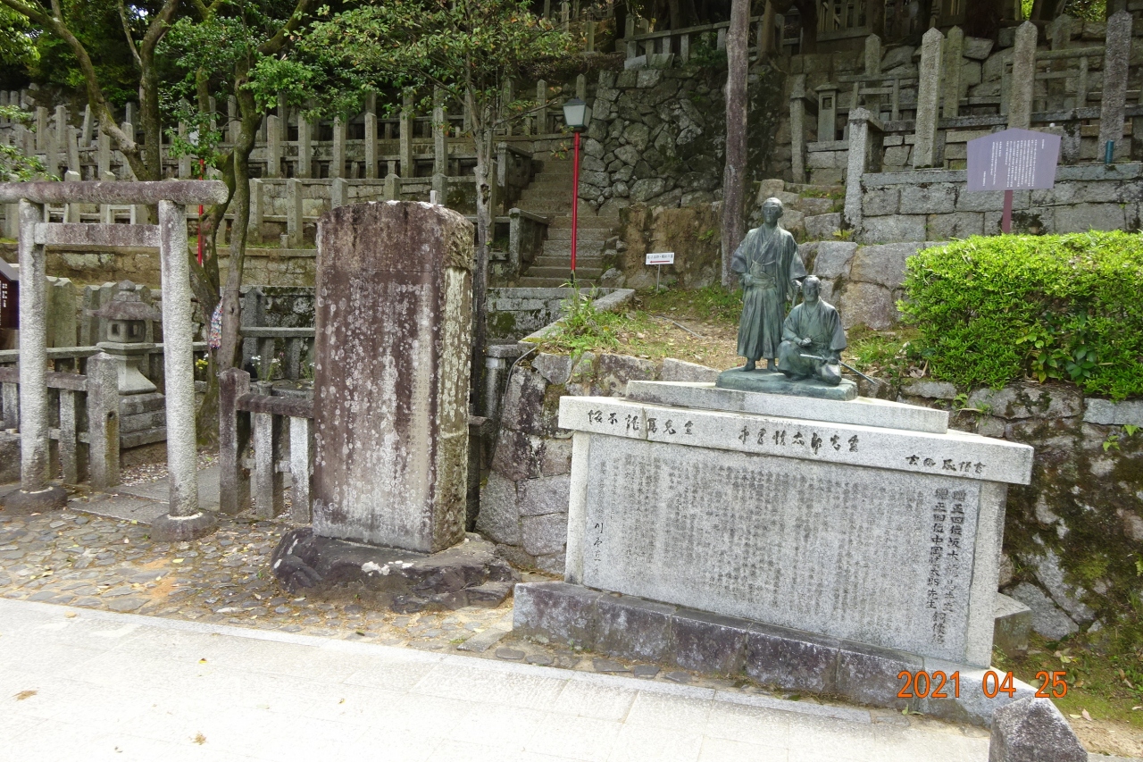 この近くに新しくできた古民家ホテル宿泊時に訪れました。ホテルのスタッフからアクセスの悪さは聞いていたのですが、想像以上に大変でした。まず護国神社に行きつくまでも結構な坂ですが、そこで300円払って、駅の改札のような入り口を入ってからもいくつも急な階段を上がってやっと辿り着く感じです。龍馬と中岡慎太郎の墓が並んでありました。
