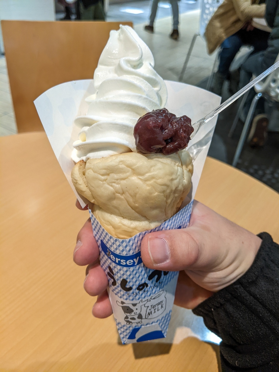 新千歳空港3F、国際線との連絡通路の国内線側にある「ジャージーブラウン」でソフトクリームで休憩。ここのソフトクリームは「うしのつの」という名前が。普通は「カップ」か「コーン」にソフトクリームが乗ってきますが、こちらでは、ふかふかのパンになっています。見た目は「コロネのソフトクリーム版」、パンですのでボリュームたっぷりで、濃厚なソフトと一緒に食べるとお腹いっぱいです。そして、トッピングが選べて、この日は「あんこ」を選びました。濃厚ソフトにあんこがあいます。これはリピート決定です!