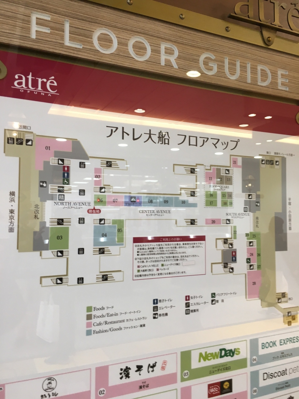 JR大船駅構内に食べ物屋等が連なっているエリアです。中央、北、南と3つのエリアに分かれていて中央は通路等なっていて駅構内であることを忘れるような通りでしたが電車の発着時には人が急に多くなります。北と南エリアはホームに繋がる階段があります。