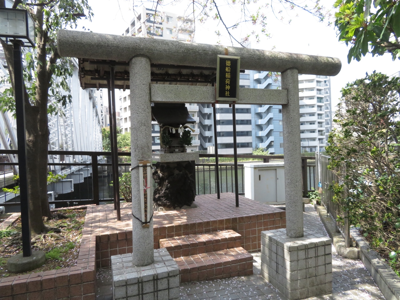 亀島川にかかる、昭和7(1932)年築の南高橋の脇に、小さな神社があります。これが、徳船稲荷神社です。