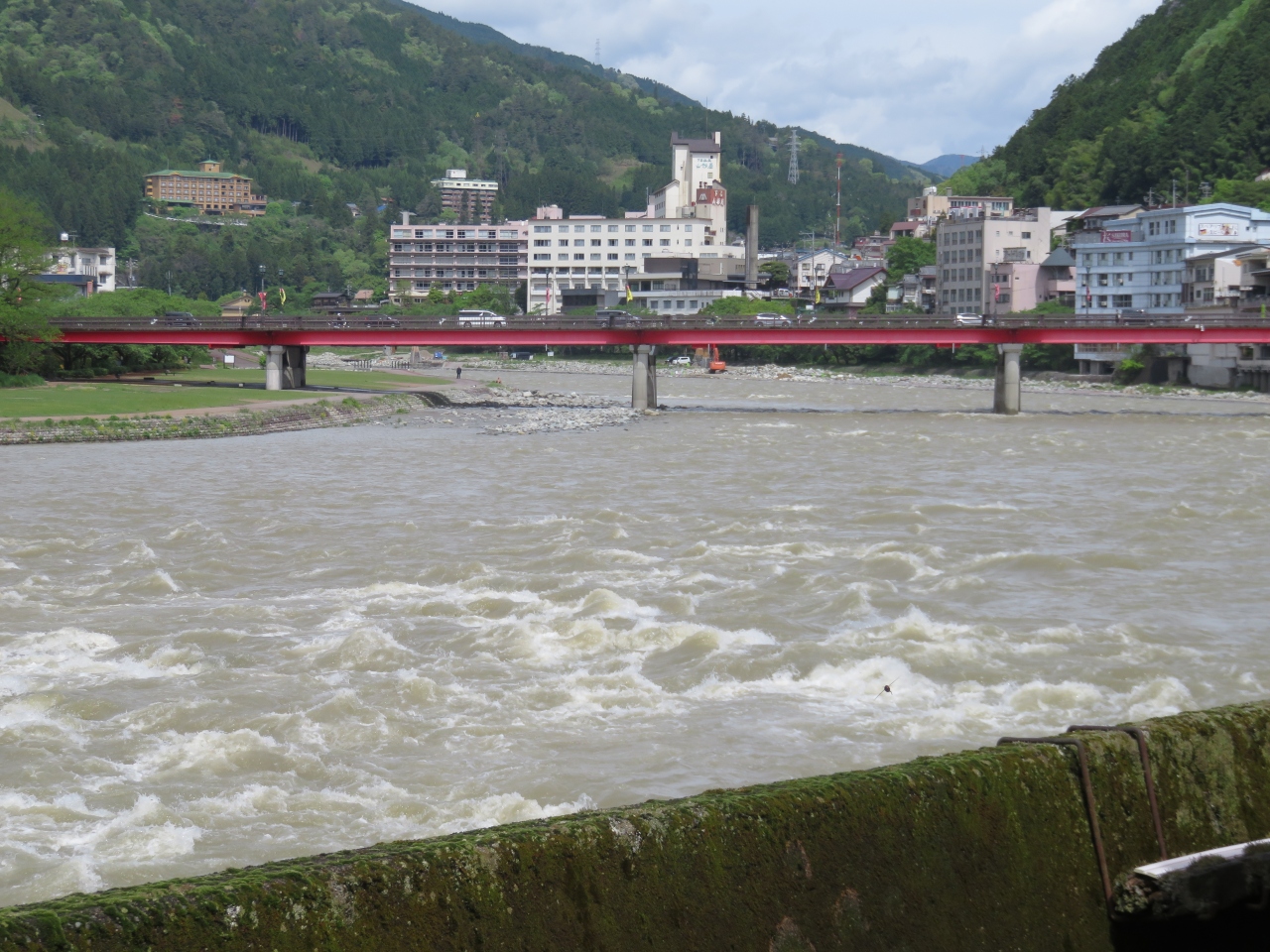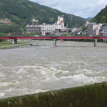 下呂市街を流れる飛騨川の今回は、雨の翌日ということで濁流でした。いつもは噴泉地など河原を楽しむ人が結構いるのですが、今回はさすがに人は少なかったです。