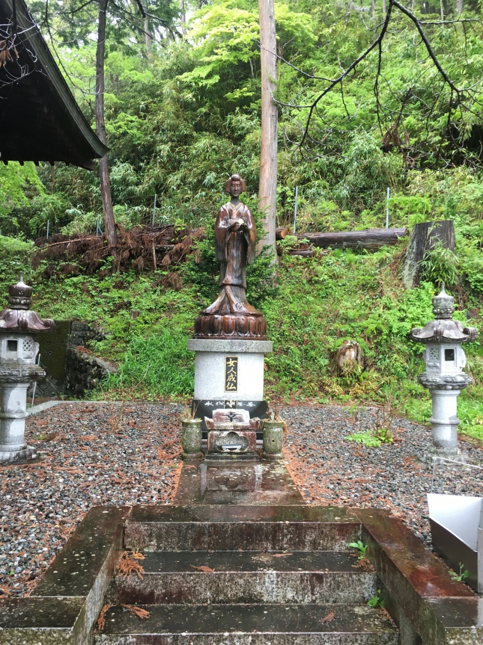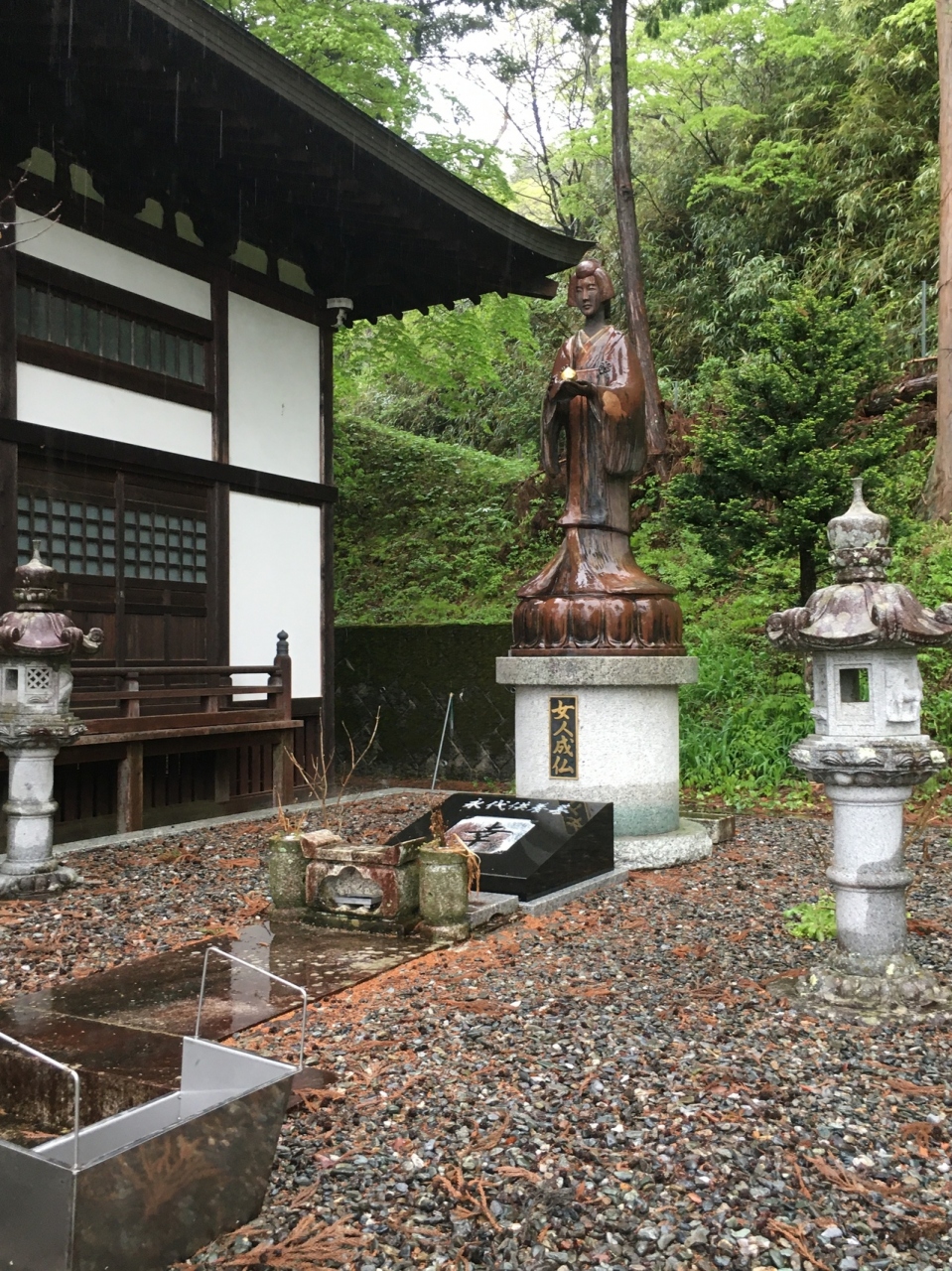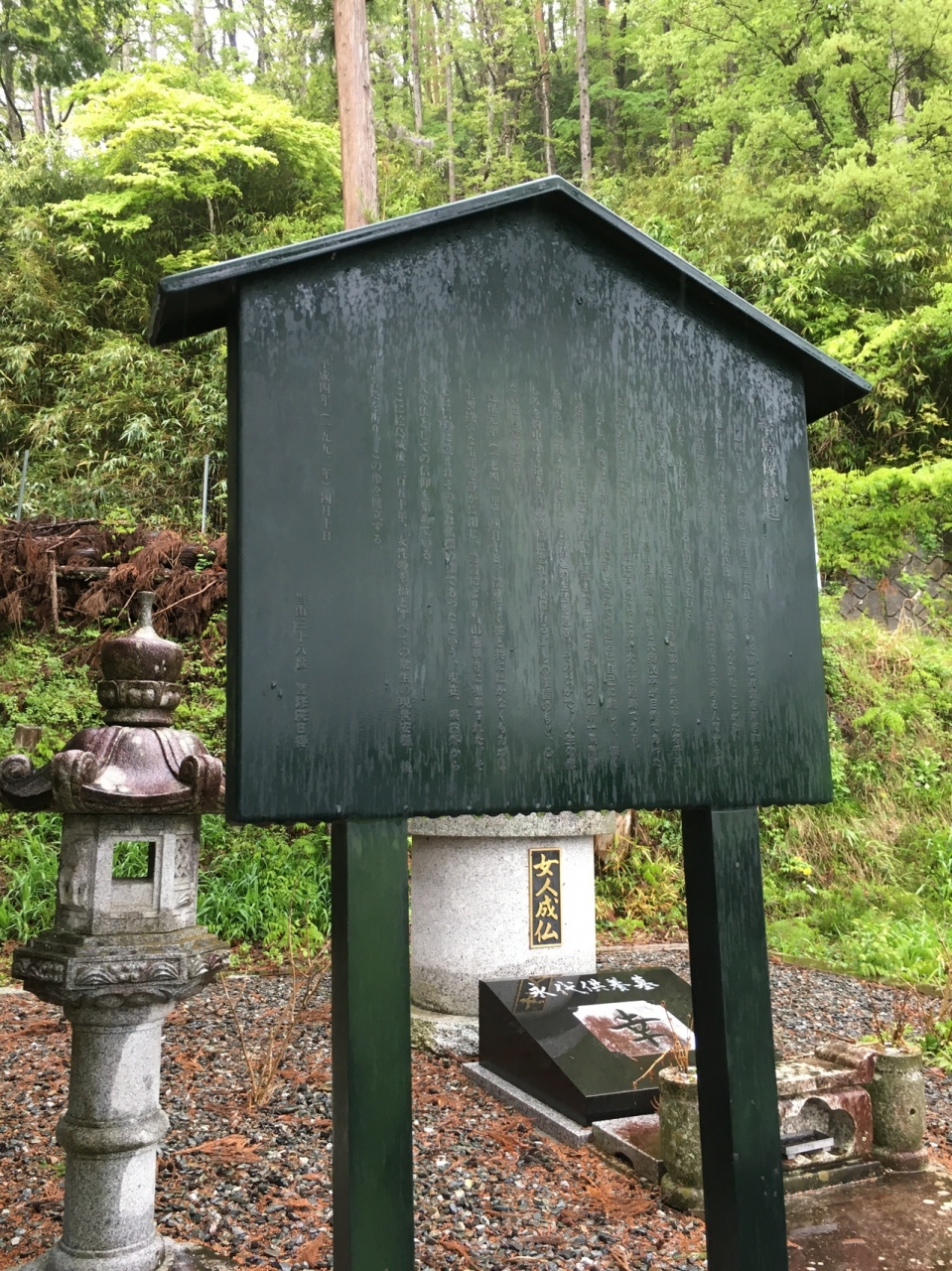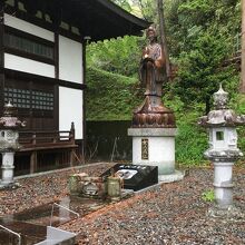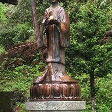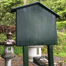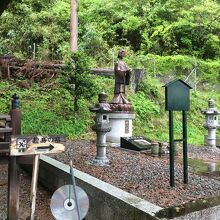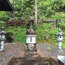 蓮華寺内にあり本堂裏手のお墓の中にありました。案内看板が4箇所あり迷わずに行くことが出来ます。七面堂の建物内の横にあり、実物大の姿の像があって、説明看板は緑色で読みにくい字でした。灯籠が左右にあり、像がツヤツヤでした。