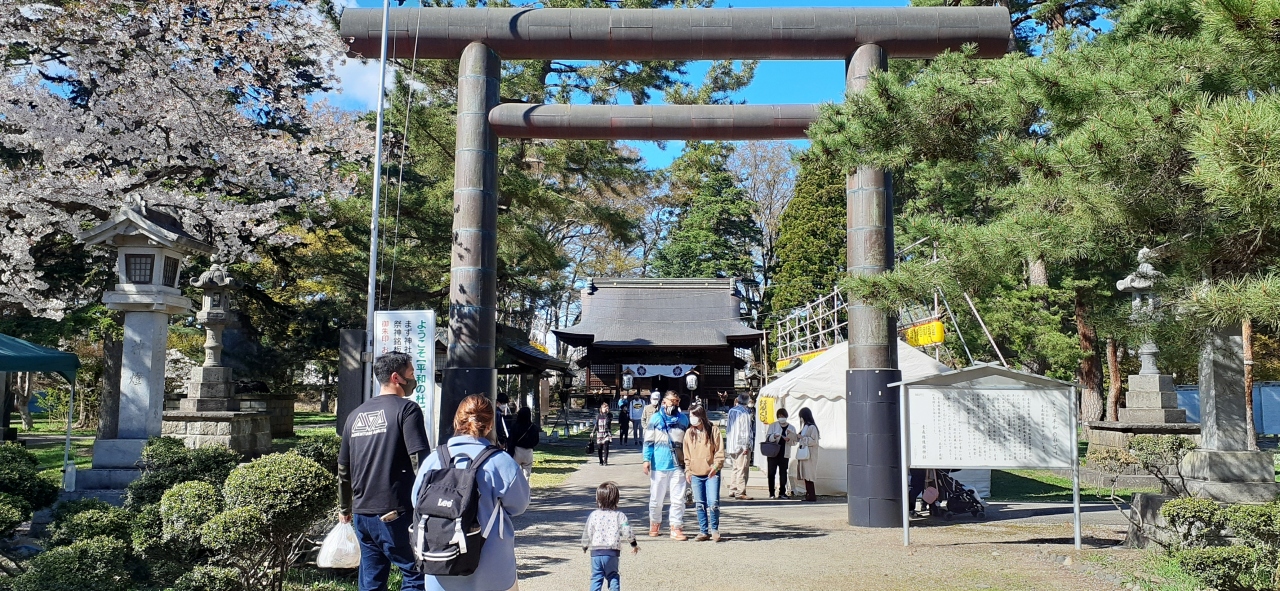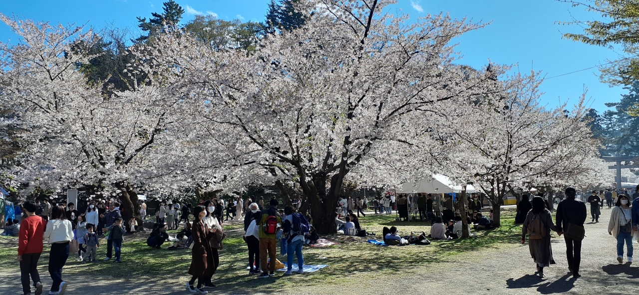 さくらまつりの時期、この神社の周辺一帯が飲食可能な場所だったので、多くの出店が出て、お祭りらしい雰囲気でした。