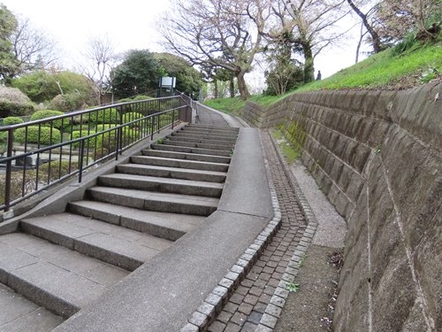 Bay-Bikeでの横浜山手散策。電動サイクルなので上り坂何するものぞ(笑)。事前予習でこの坂はクルマが通れない坂だと知っていましたが、どこにあるのか、というと…元町公園の北縁に沿って山手本通りから分かれて下っていく坂でした。元町公園自体も起伏が激しく園路のアップダウンが読めませんでしたが、「ジェラールの瓦工場と水屋敷跡」を探して徒歩で下りました。元町公園を抜けて進むと代官坂へと合流していくようです。なかなか存在感のある坂です。