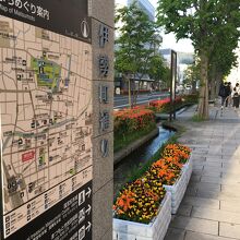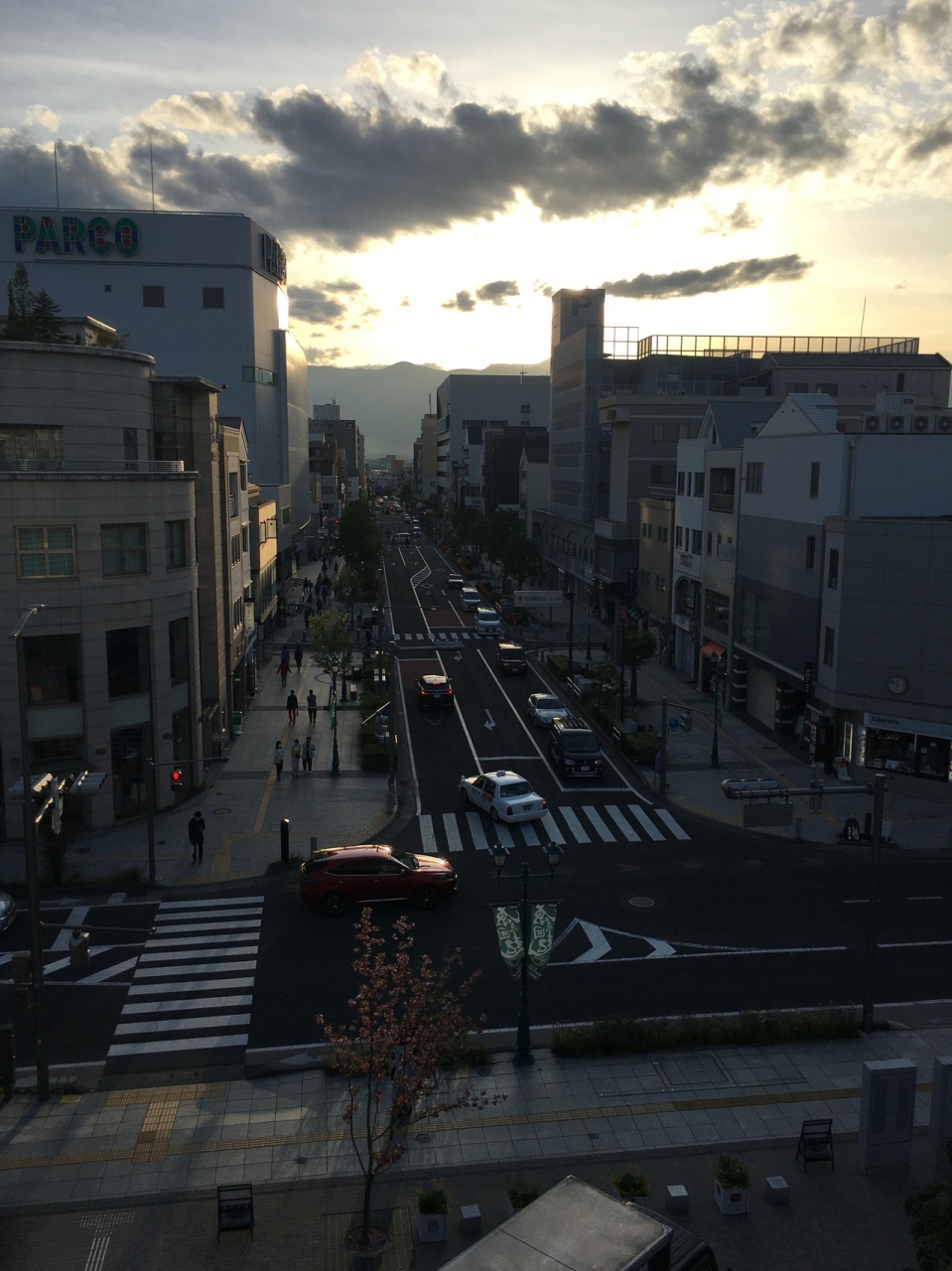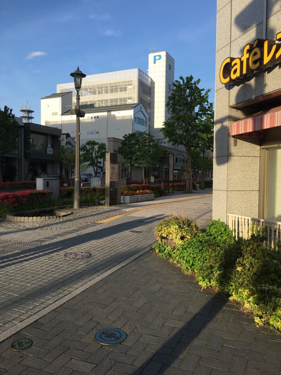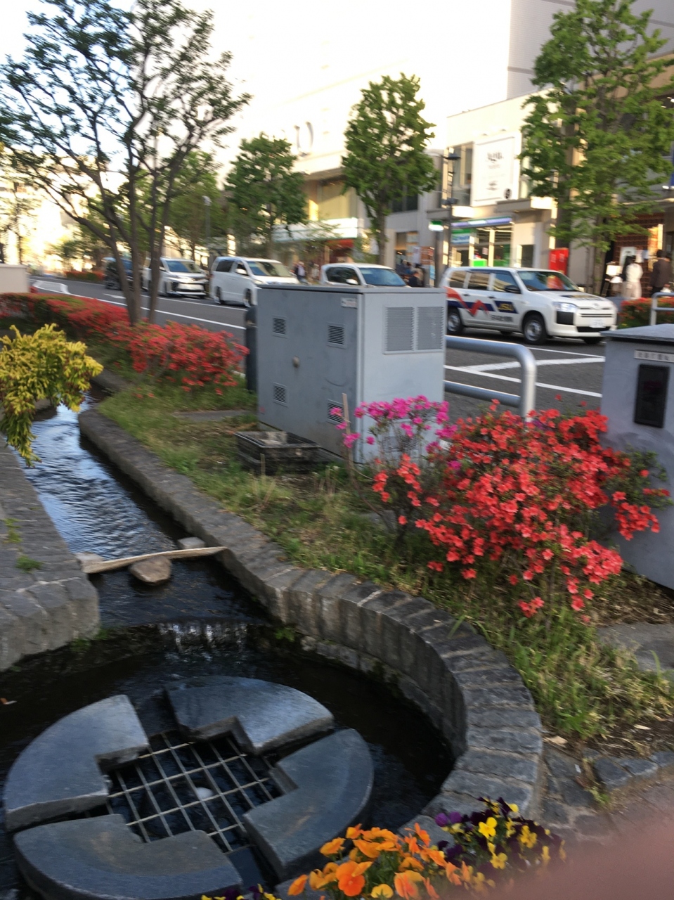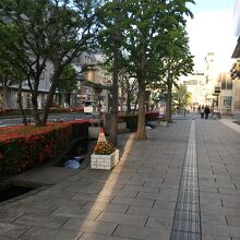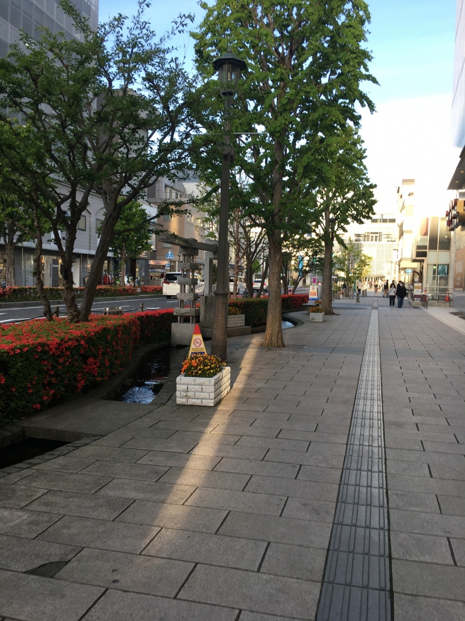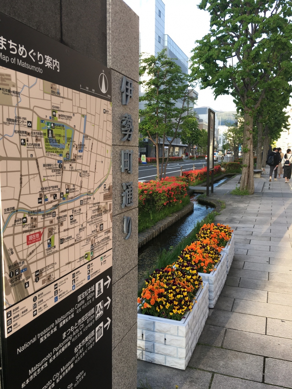 松本市内の中心地にありPARCOの建物もあって、信濃毎日新聞のビルもありました。自動車の左右に遊歩道があって木々が立ち、花壇の花が綺麗でした。用水路のようなものもあり水が流れほっとする歩きやすい道でした。